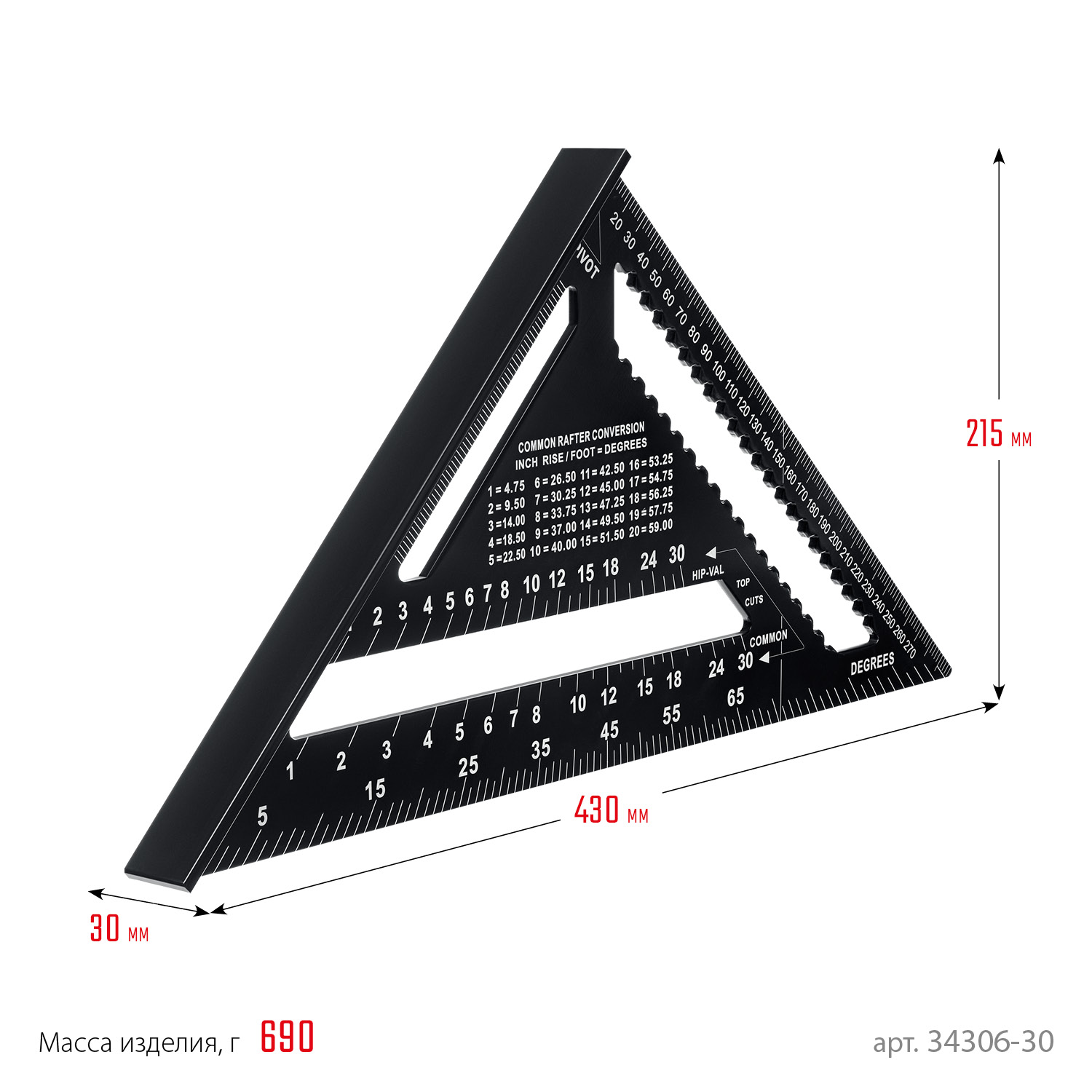 Универсальный кровельный угольник инструмент для точного определения расстояния в диапазоне от 0 до 300 мм. Может применяться в качестве торцовочного угольника, транспортира, рейсмуса и направляющей для пилы.