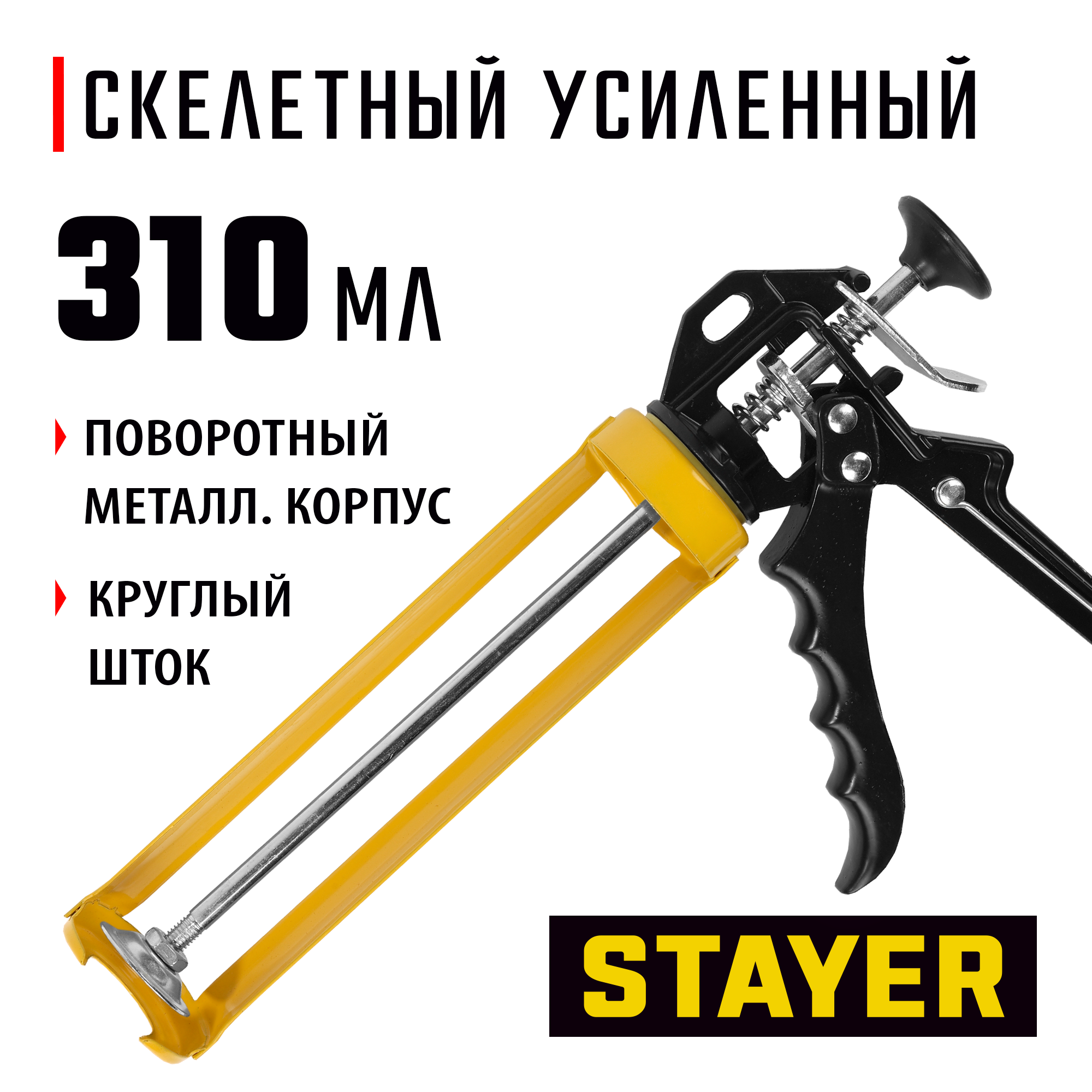Пистолет для герметиков подходит для работы с картриджами объемом 310 мл, имеет усиленную скелетную конструкцию из стали, ручку из алюминиевого сплава, которые способствуют равномерной подачи клея либо герметика. Данная спецификация обеспечивает прочность и надежность конструкции пистолета при использовании.