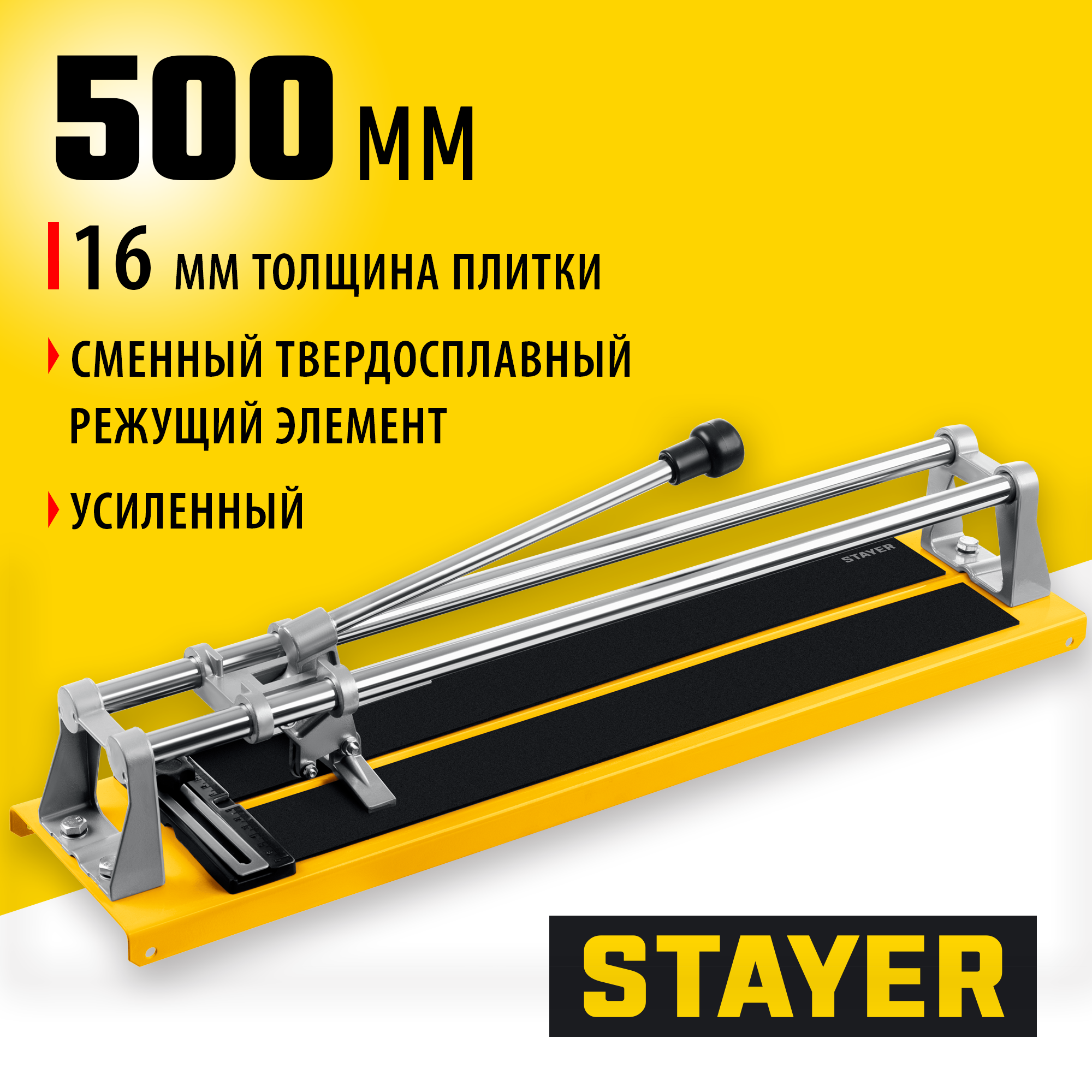 Плиткорез STAYER - правильный выбор! Оснащен сменным твердосплавным режущим элементом, . Металлические направляющие обеспечивают точный и плавный разрез керамической плитки. Усиленная платформа и опоры позволяют проводить работы с керамической плиткой повышенной толщины и увеличивают срок службы плиткореза.