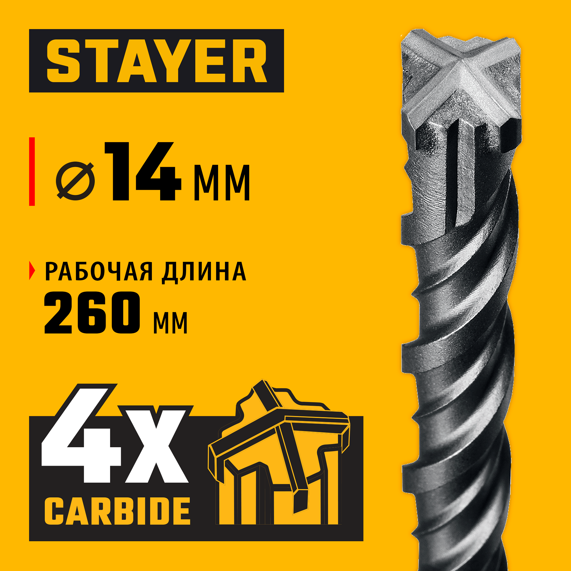 Буры STAYER HERCULES-4Х - надежный инструмент, отвечающий самым высоким требованиям качества и для любой сложности работ. Применяются при сверлении отверстий в бетоне, граните, кирпичной кладке, камне и твердых известняках.