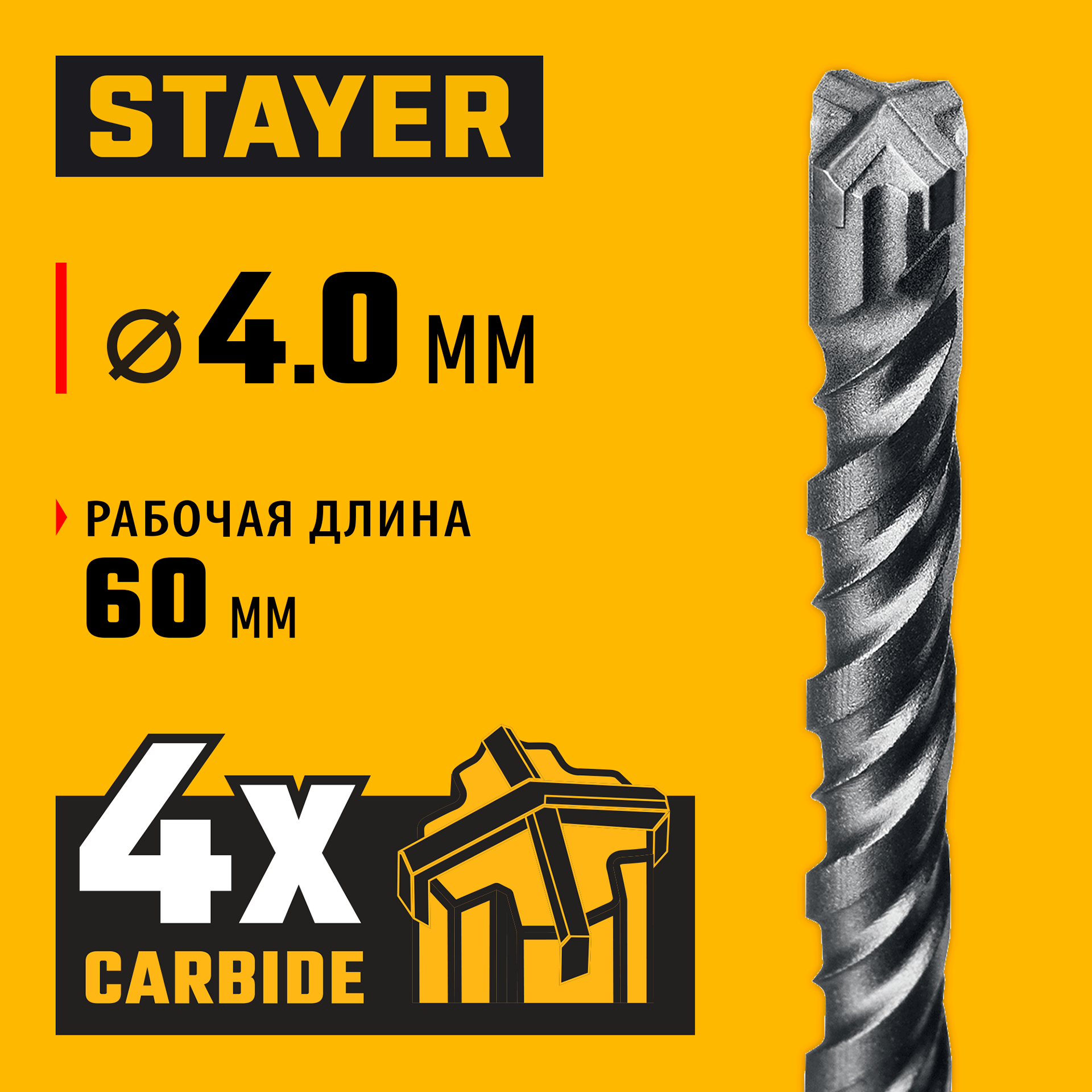 Буры STAYER HERCULES-4Х - надежный инструмент, отвечающий самым высоким требованиям качества и для любой сложности работ. Применяются при сверлении отверстий в бетоне, граните, кирпичной кладке, камне и твердых известняках.