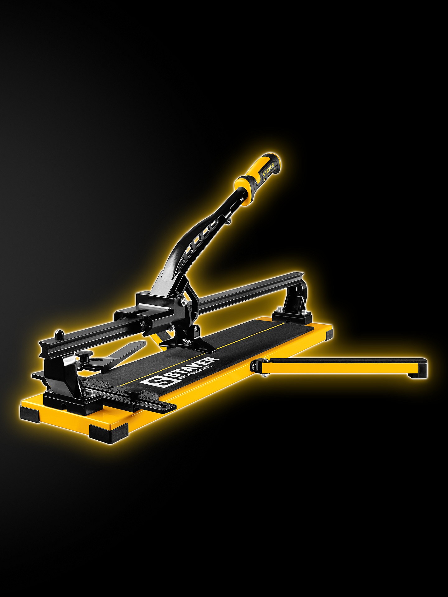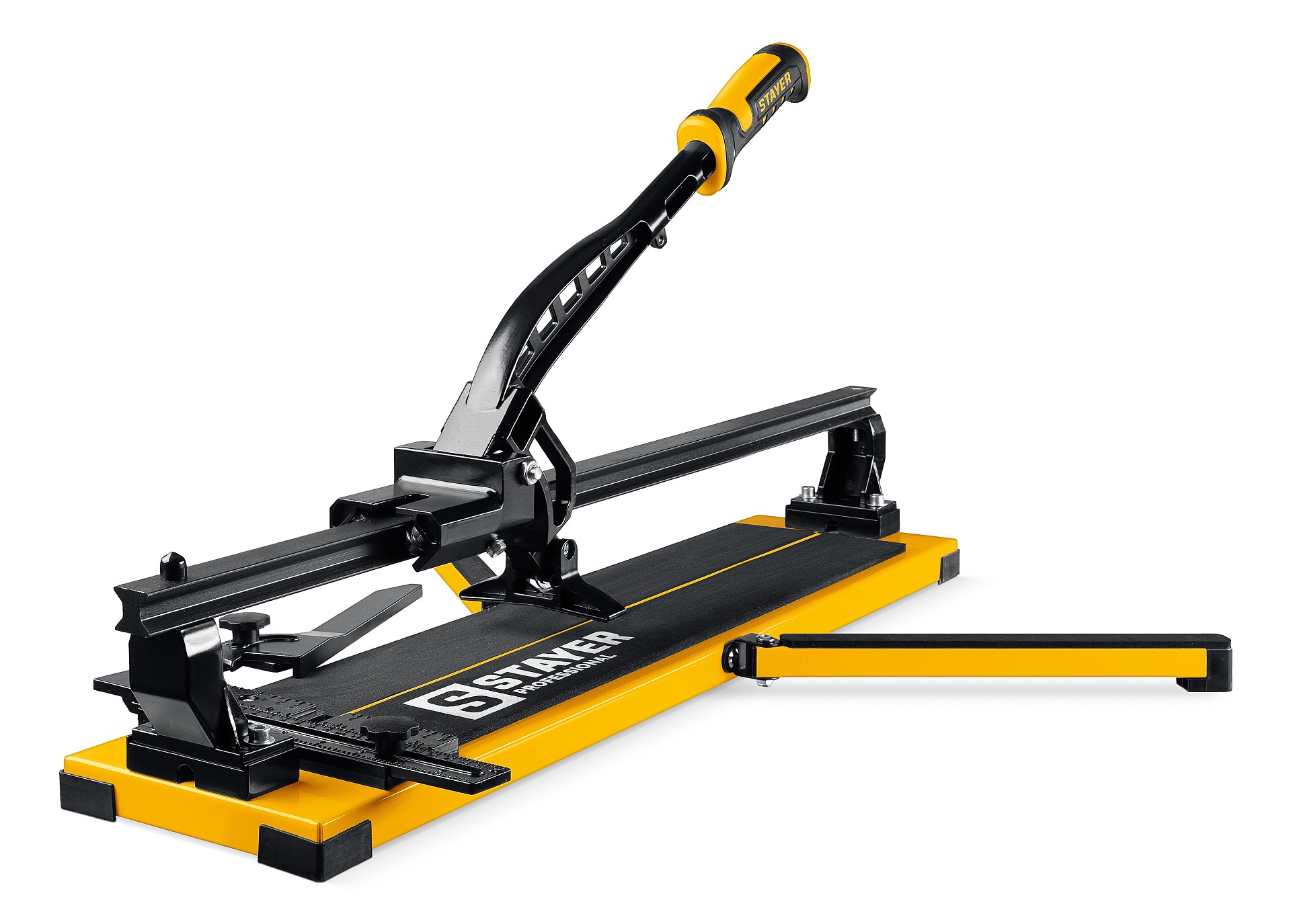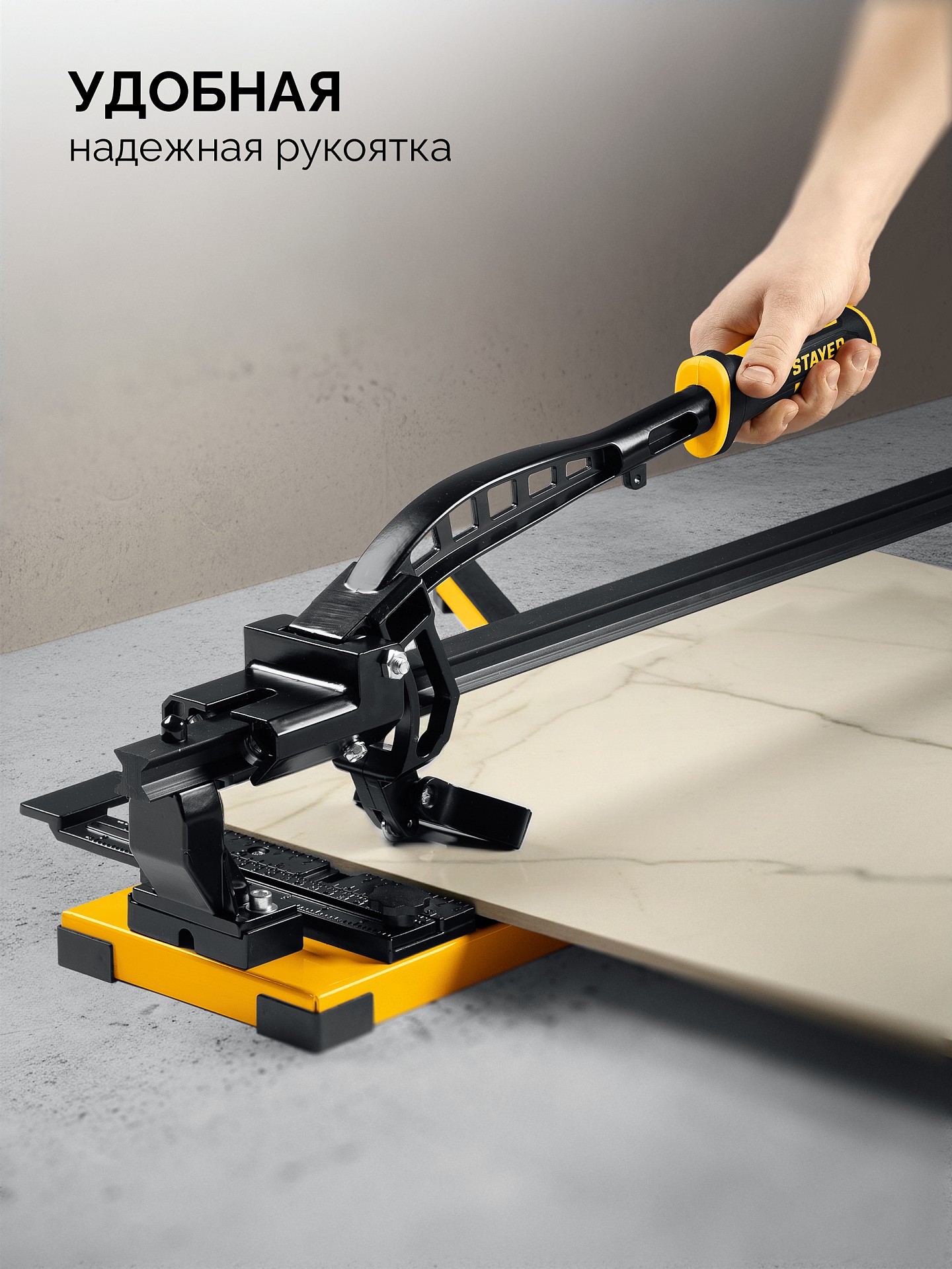 Усиленный плиткорез на монорельсе STAYER имеет самый плавный рез благодаря каретке и режущему элементу на подшипниках. Боковые опоры позволя т резать шировкую плитку.