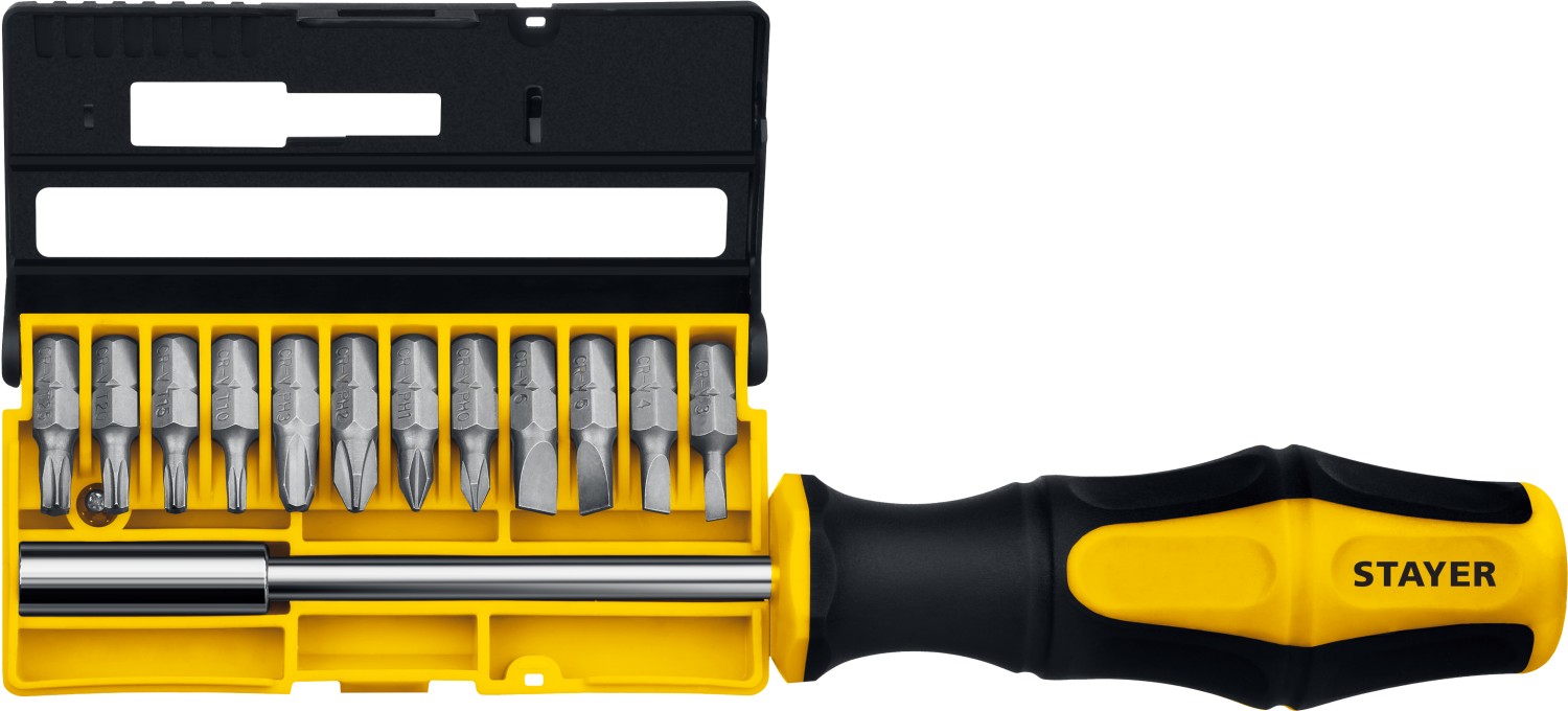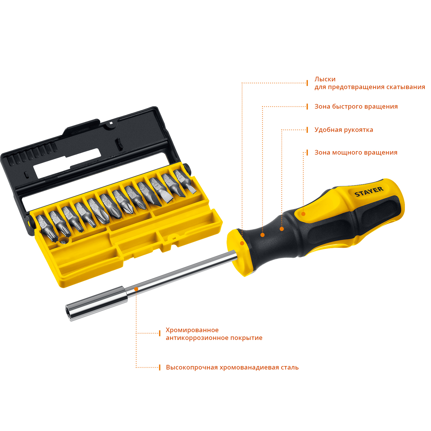 Отвертка-битодержатель с набором высококачественных бит из Cr-V стали. Особый держатель бит и отвертки для компактного хранения набора