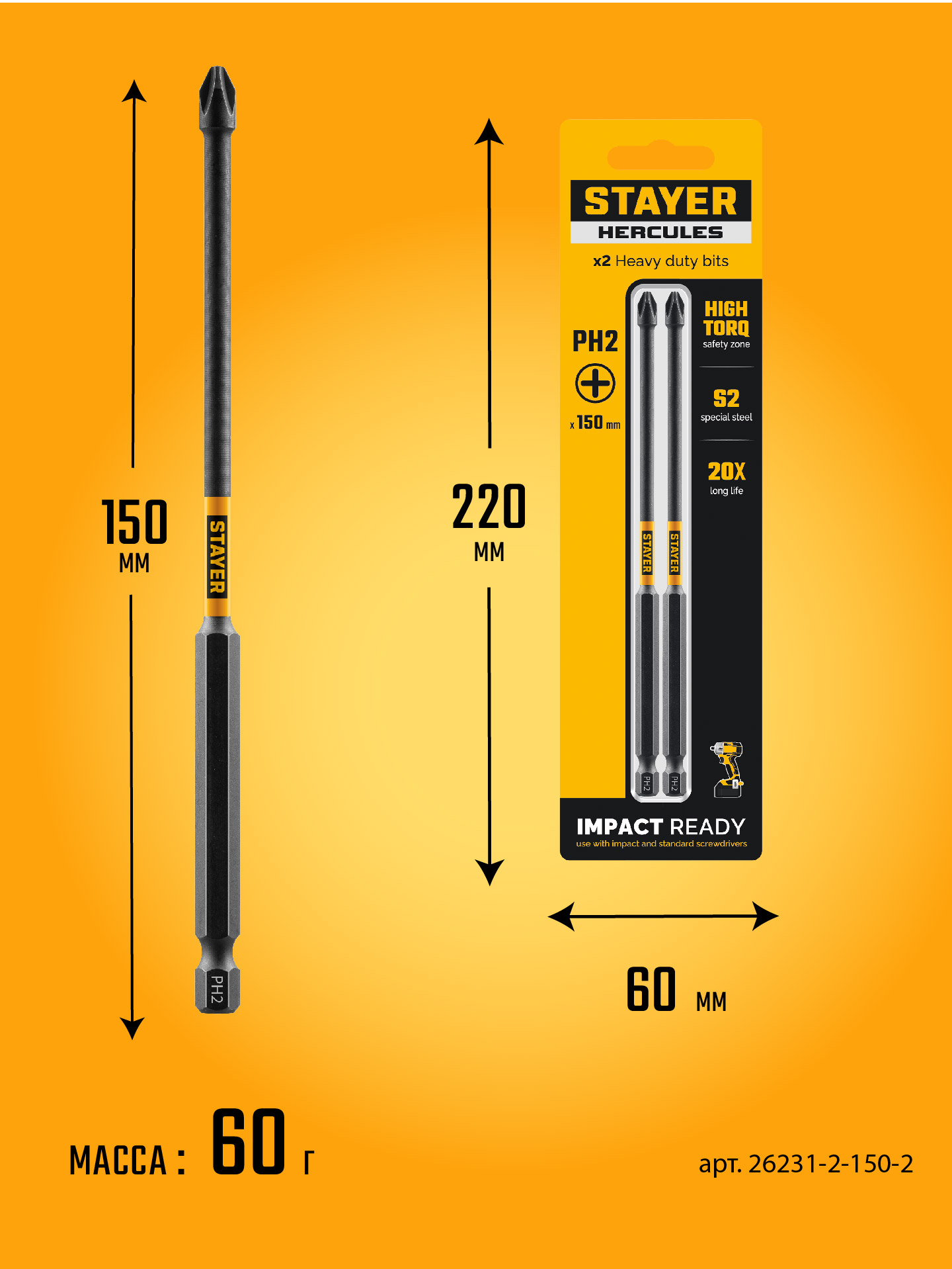 STAYER HERCULES, PH2, 150 мм, 2 шт, торсионные биты (26231-2-150-2)