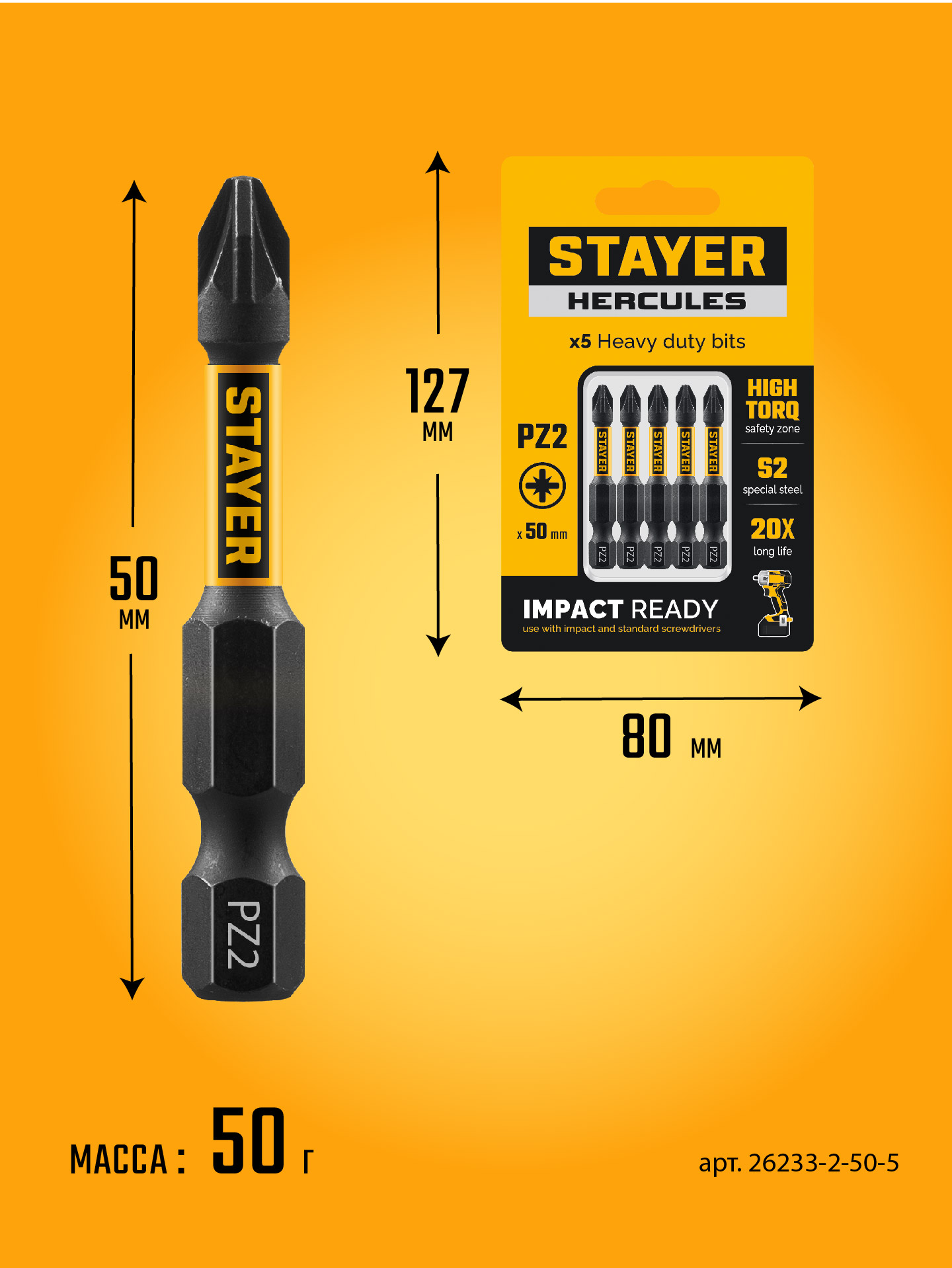 STAYER HERCULES, PZ2, 50 мм, 5 шт, торсионные биты (26233-2-50-5)