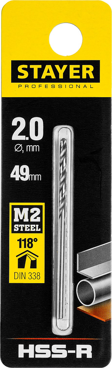 STAYER HSS-R, 2.0 х 49 мм, быстрорежущая сталь P6M5, сверло по металлу, Professional (29602-2)