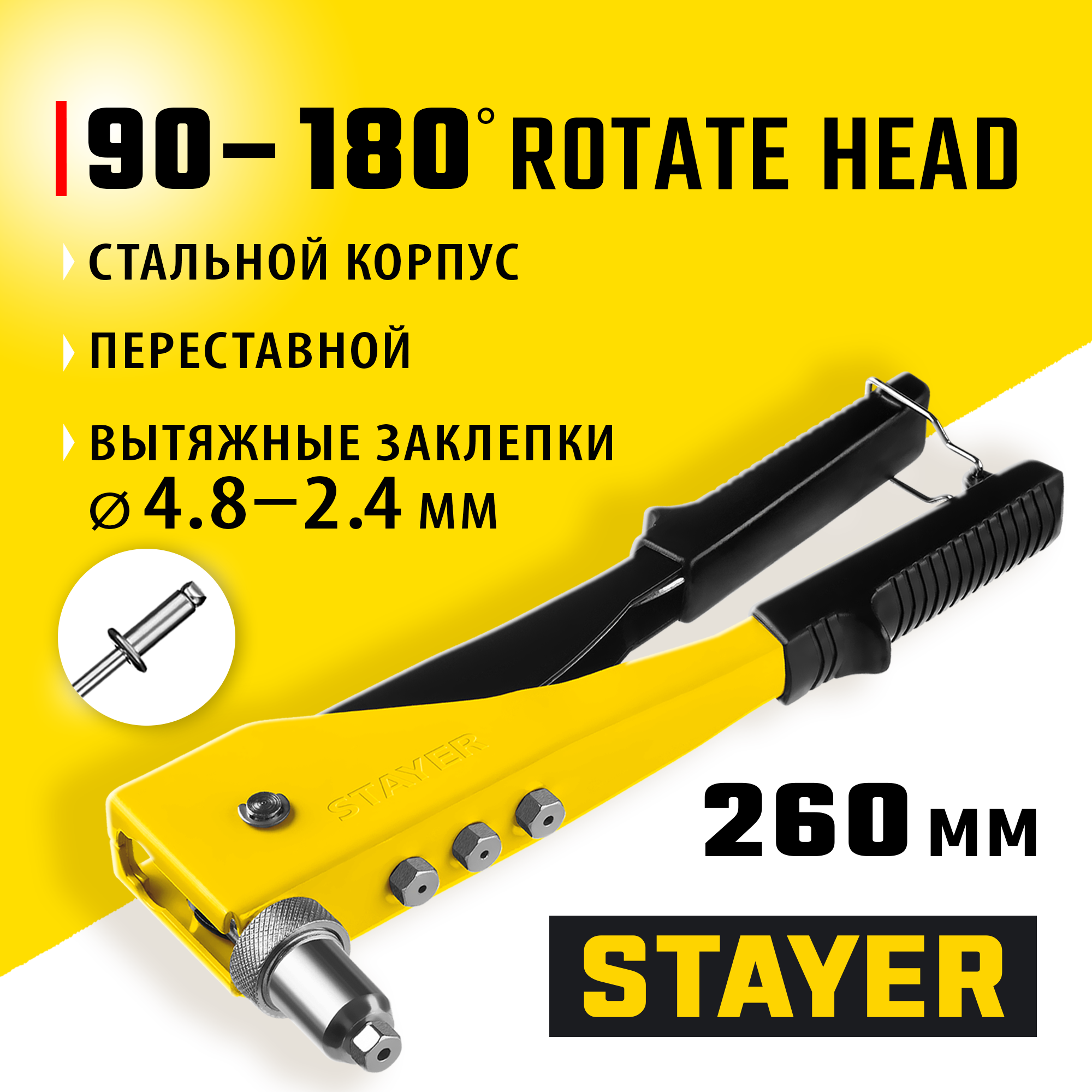 - Переставная голова может быть установлена под углом 90° или 180° к корпусу для осуществления нестандартного монтажа заклепок