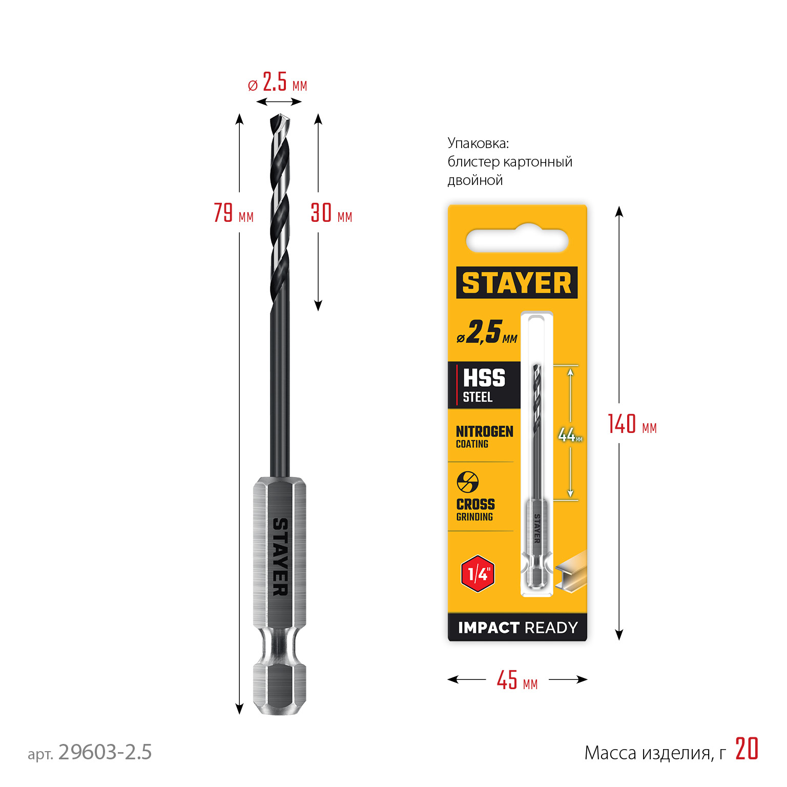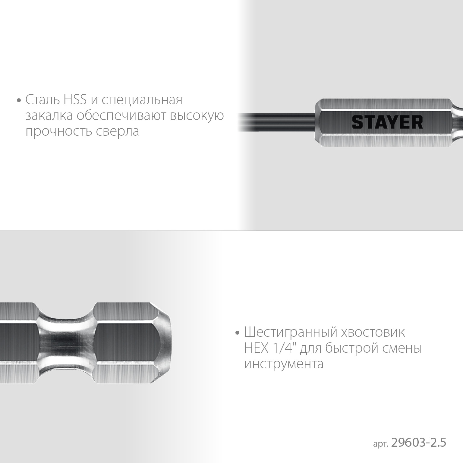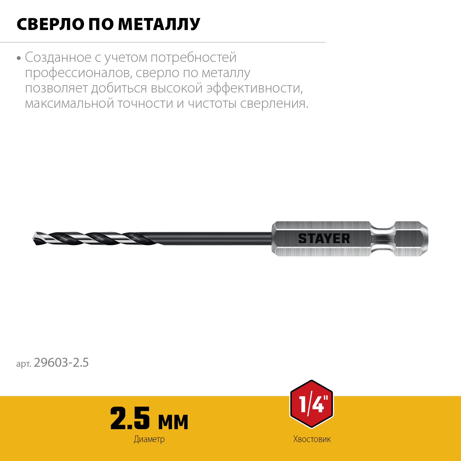 STAYER НЕХ-1/4″, d 2.5 х 79 мм, сверло по металлу для винтовёртов и шуруповертов IMPACT READY (29603-2.5)