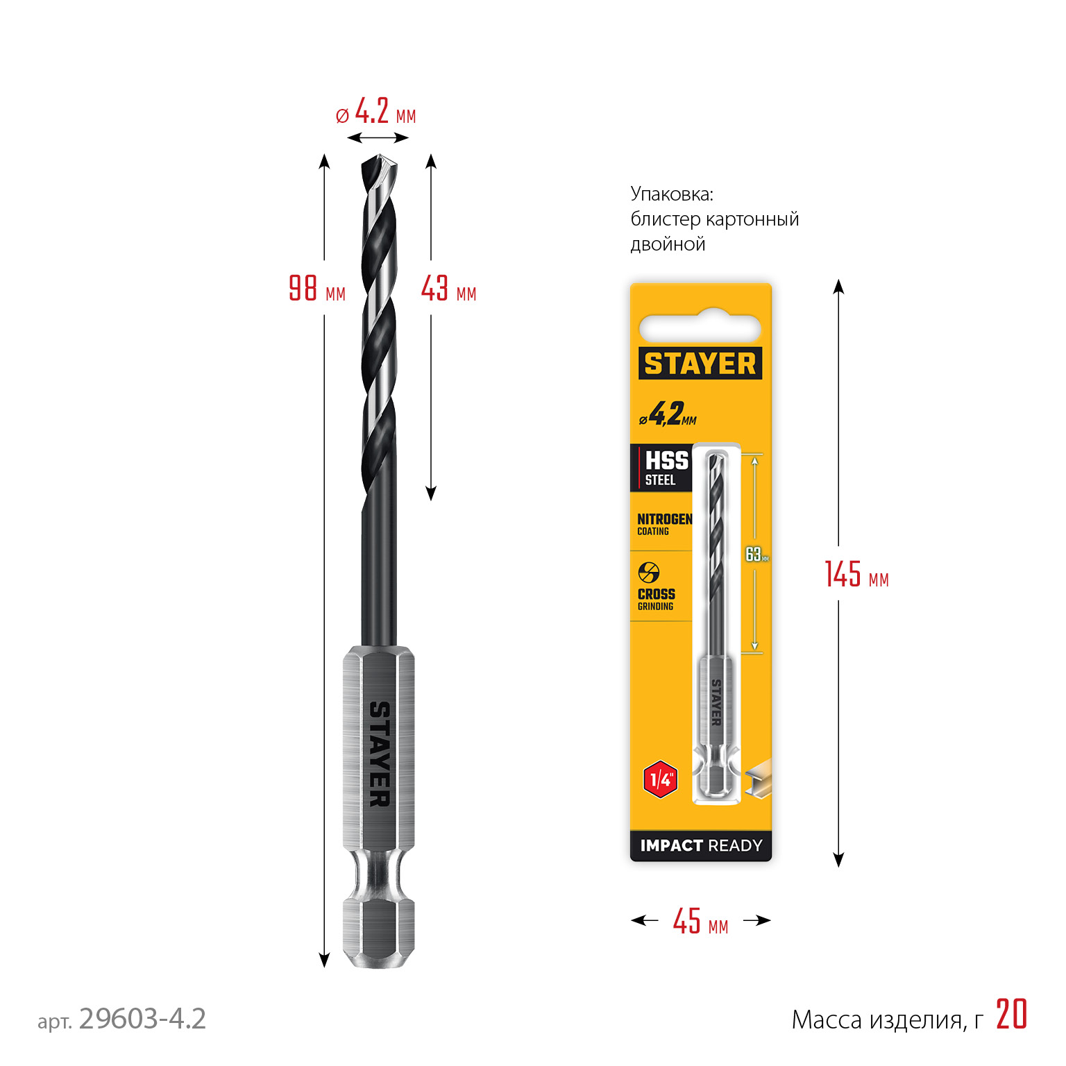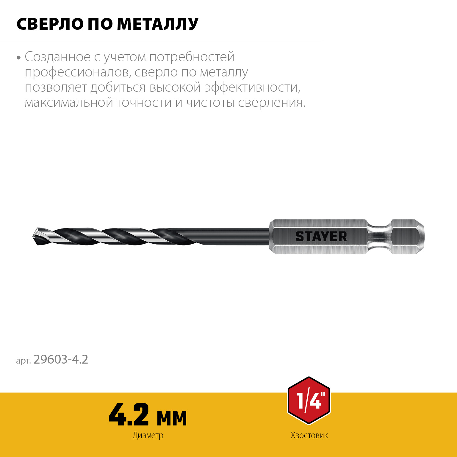 STAYER НЕХ-1/4″, d 4.2 х 98 мм, сверло по металлу для винтовёртов и шуруповертов IMPACT READY (29603-4.2)