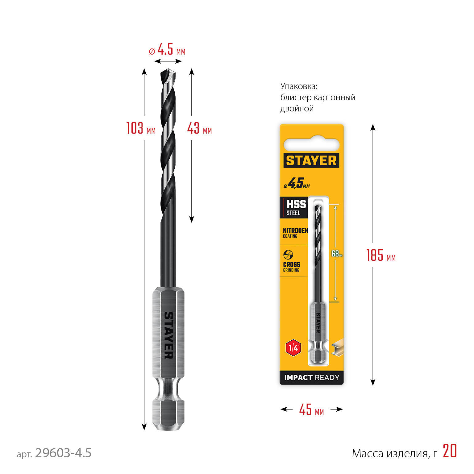STAYER НЕХ-1/4″, d 4.5 х 103 мм, сверло по металлу для винтовёртов и шуруповертов IMPACT READY (29603-4.5)