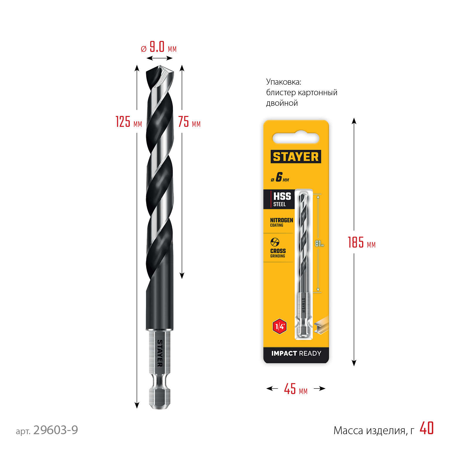 STAYER НЕХ-1/4″, d 9.0 х 125 мм, сверло по металлу для винтовёртов и шуруповертов IMPACT READY (29603-9)