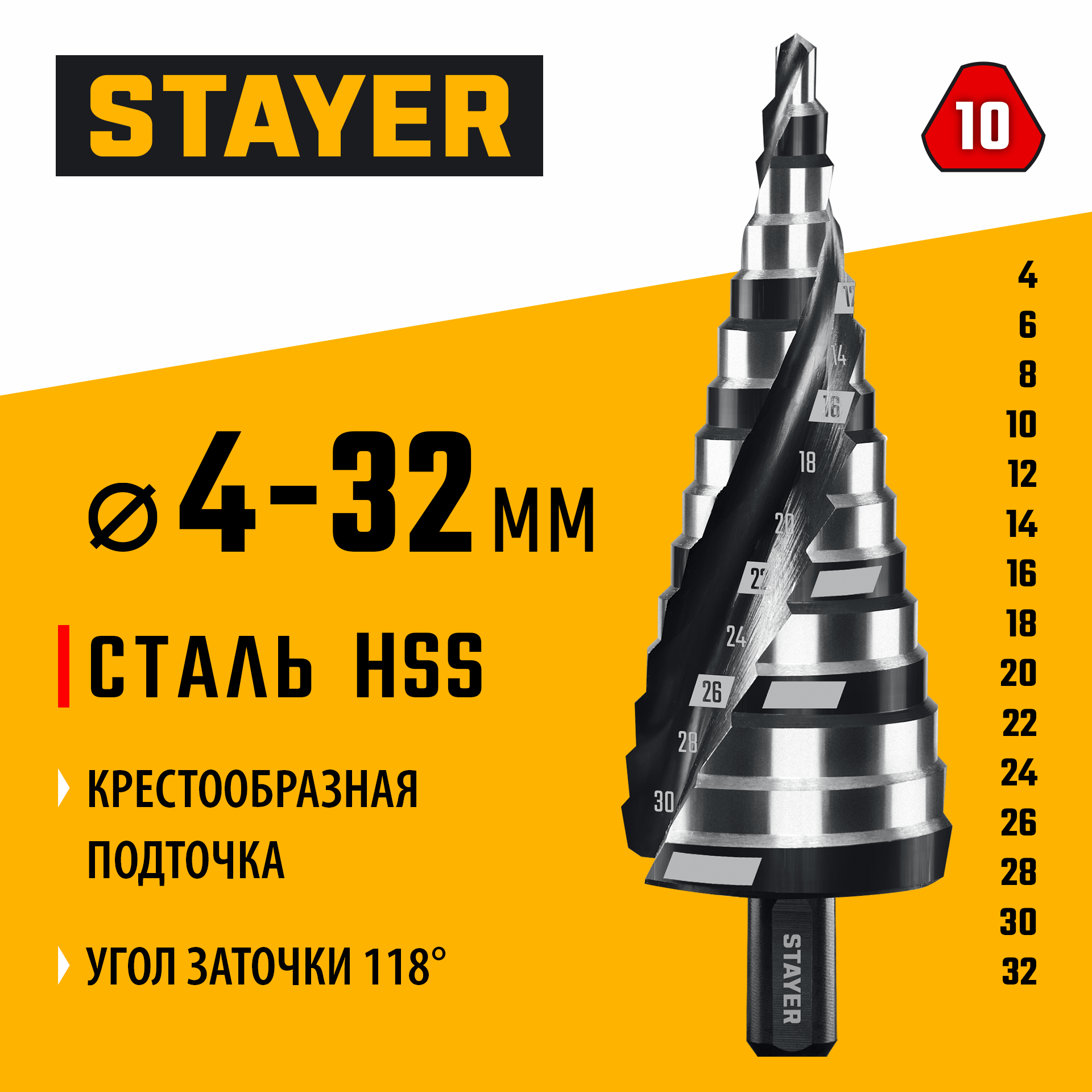 STAYER Pro-Max 4-32мм, 15 ступеней, винтовая спираль, сверло ступенчатое (29661-4-32-15)