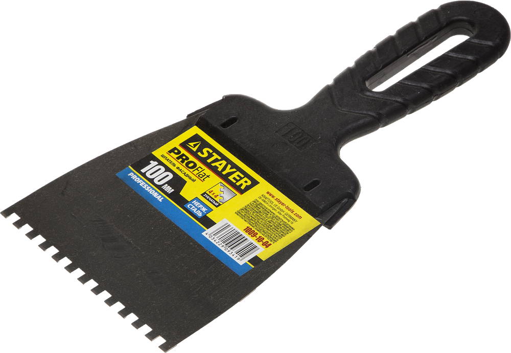 Благодаря зубчатой кромке шпатель идеально подходит для работы со строительными и клеевыми смесями, полотно из нержавеющей стали обеспечивает надежность и долгий срок службы, а удобная пластмассовая рукоятка создает условия для комфортной работы