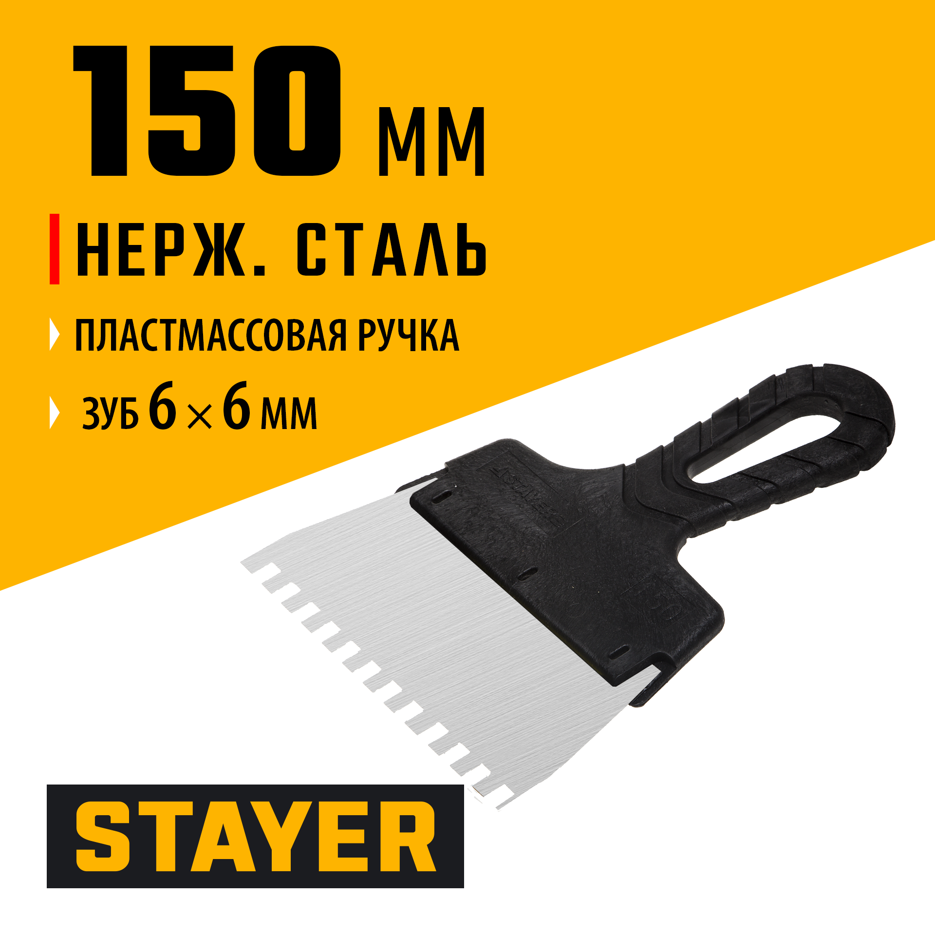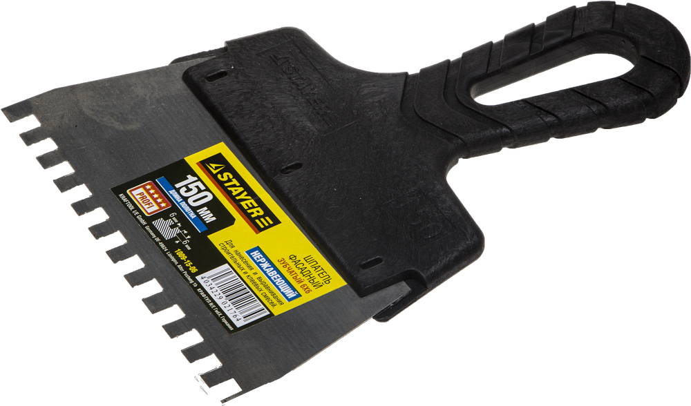 Благодаря зубчатой кромке шпатель идеально подходит для работы со строительными и клеевыми смесями, полотно из нержавеющей стали обеспечивает надежность и долгий срок службы, а удобная пластмассовая рукоятка создает условия для комфортной работы
