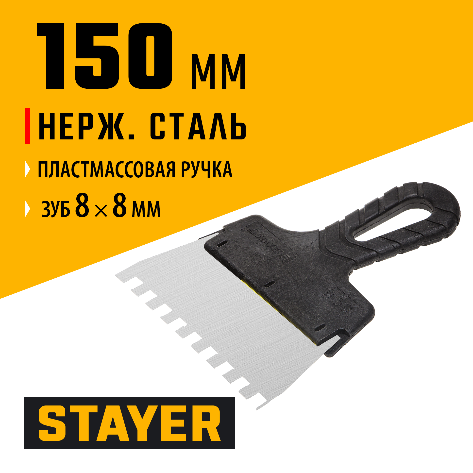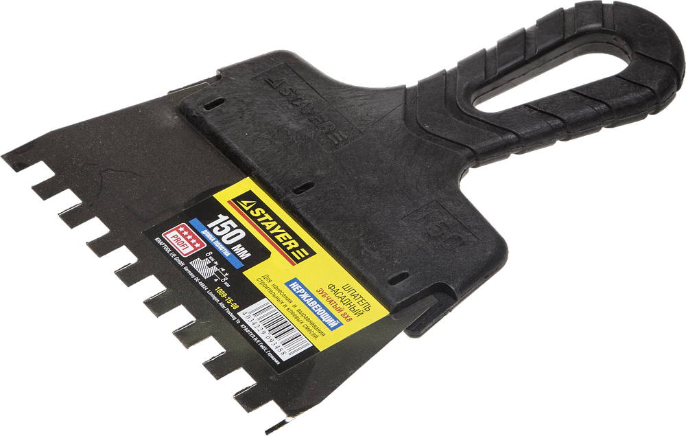 Благодаря зубчатой кромке шпатель идеально подходит для работы со строительными и клеевыми смесями, полотно из нержавеющей стали обеспечивает надежность и долгий срок службы, а удобная пластмассовая рукоятка создает условия для комфортной работы