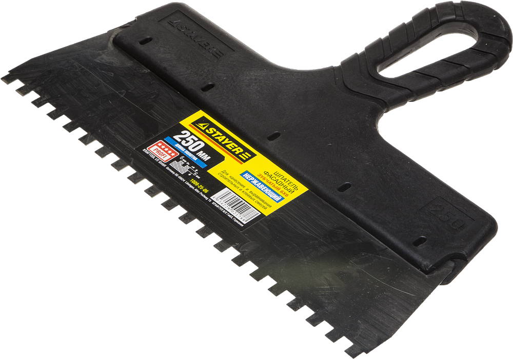 Благодаря зубчатой кромке шпатель идеально подходит для работы со строительными и клеевыми смесями, полотно из нержавеющей стали обеспечивает надежность и долгий срок службы, а удобная пластмассовая рукоятка создает условия для комфортной работы