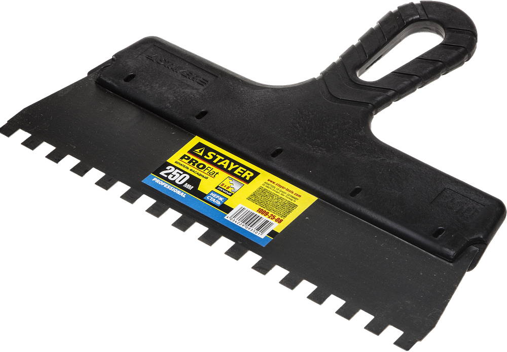 Благодаря зубчатой кромке шпатель идеально подходит для работы со строительными и клеевыми смесями, полотно из нержавеющей стали обеспечивает надежность и долгий срок службы, а удобная пластмассовая рукоятка создает условия для комфортной работы