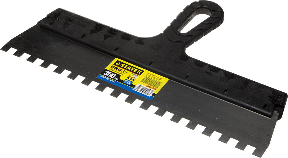 Благодаря зубчатой кромке шпатель идеально подходит для работы со строительными и клеевыми смесями, полотно из нержавеющей стали обеспечивает надежность и долгий срок службы, а удобная пластмассовая рукоятка создает условия для комфортной работы