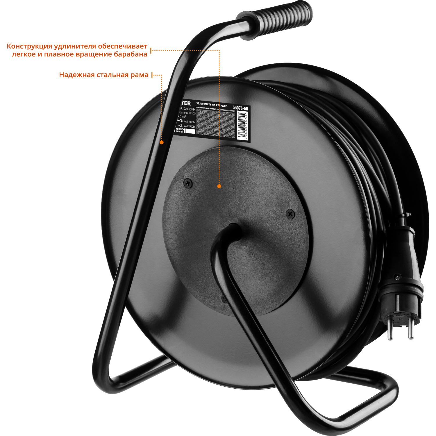 - Катушка позволяет легко сматывать и разматывать кабель, обеспечивая мобильное перемещение и компактное хранение.