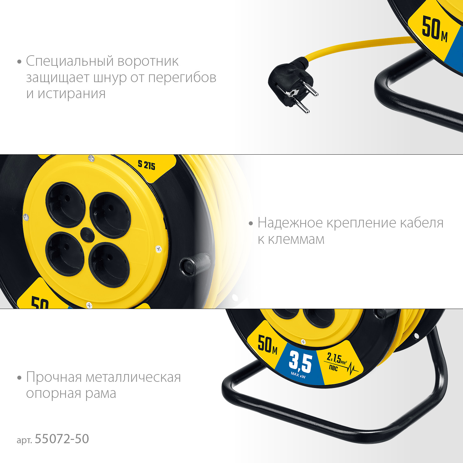 • Катушка позволяет легко сматывать и разматывать кабель, обеспечивает компактное хранение.