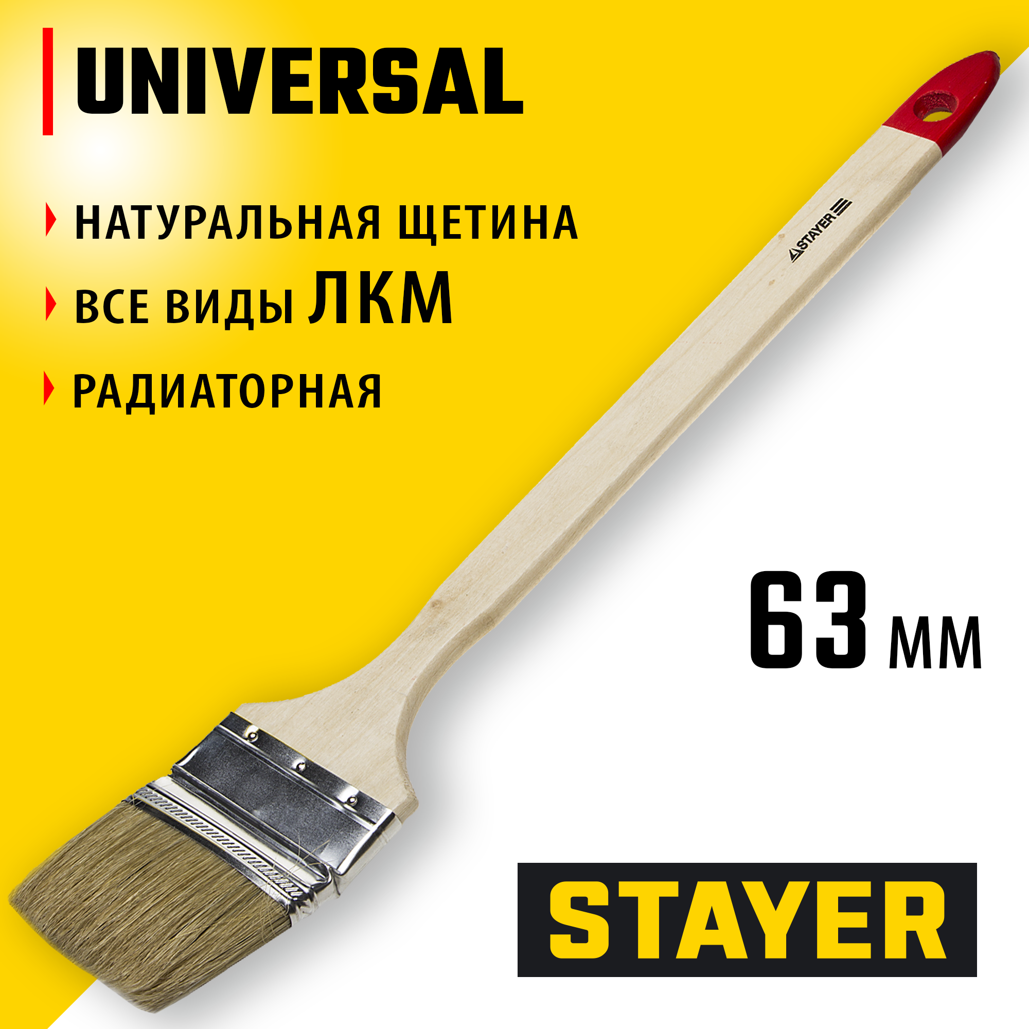 STAYER UNIVERSAL, 63 мм, 2.5″, светлая натуральная щетина, деревянная ручка, все виды ЛКМ, радиаторная кисть (0111-63)
