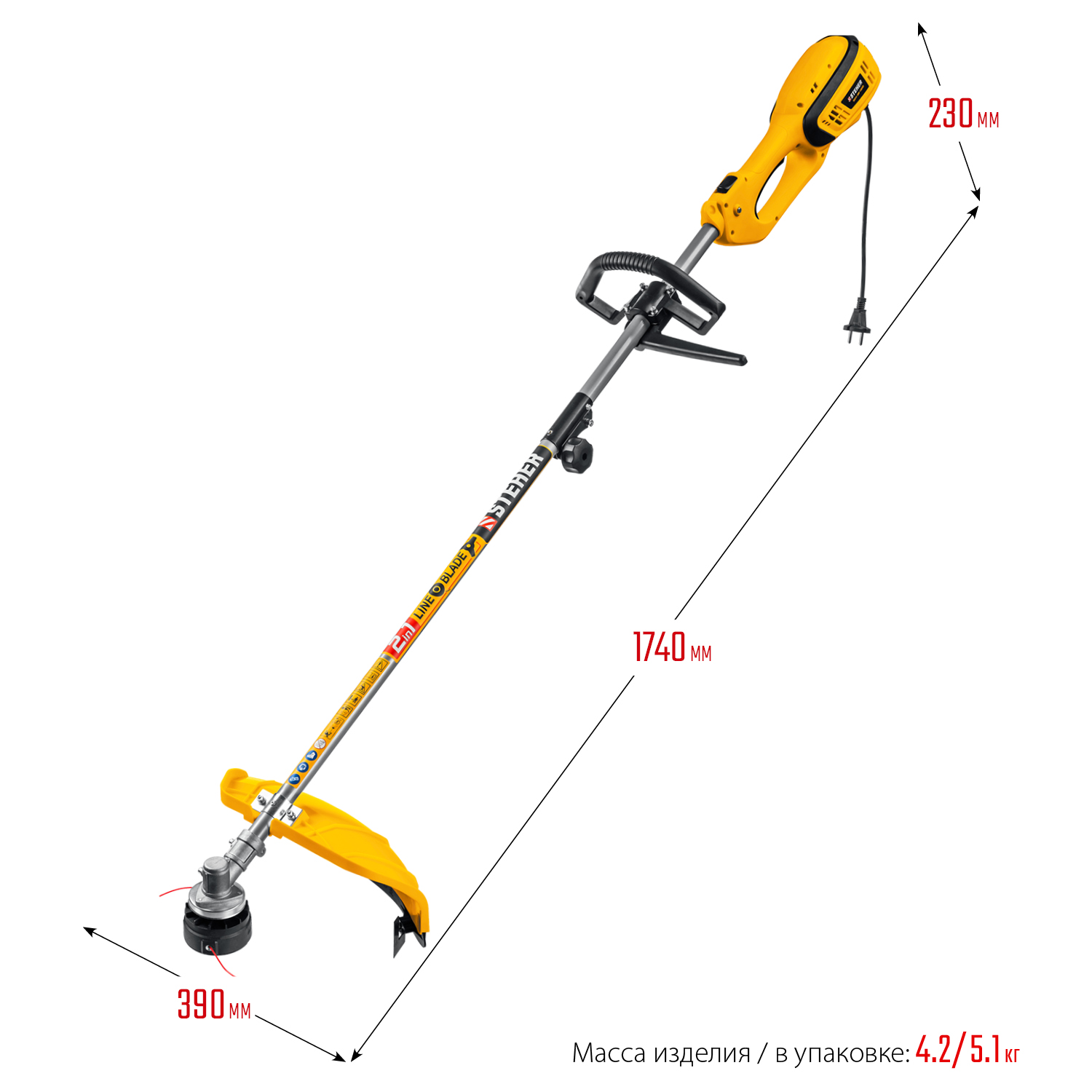- Возможность установки двух видов режущего инструмента - лески и ножа - делают изделие универсальным