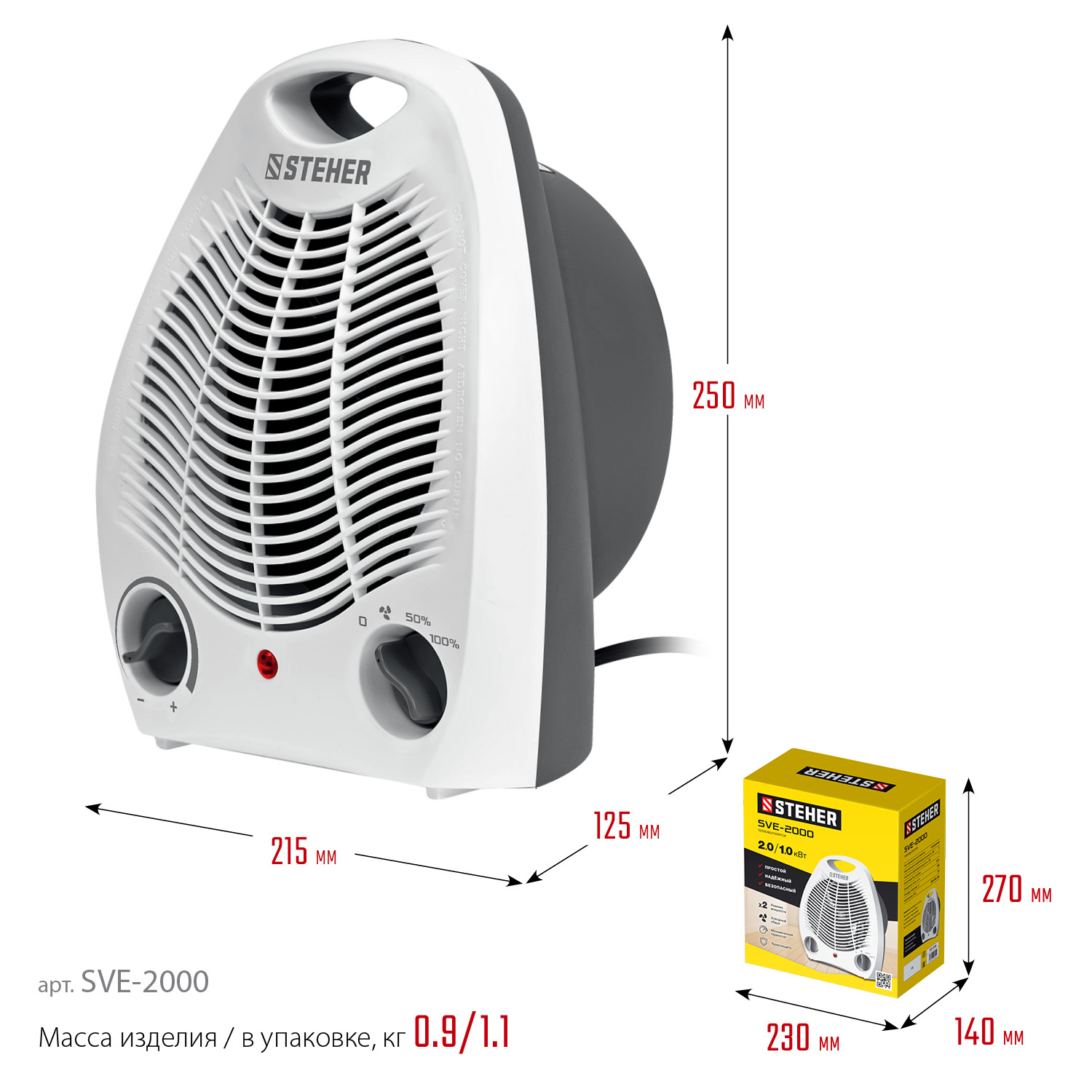 Тепловентилятор STEHER SVE оснащен высокоэффективным игольчатым нагревательным элементом 2000 Вт.Мгновенно обогревает помещение площадью до 20 м². Тепловентилятор отличается пониженным уровнем шума в процессе работы, что делает его использование максимально комфортным. Режим вентиляции без обогрева позволяет использовать прибор и летом в качестве обычного вентилятора. Возможность регулирования, как мощности, так и температуры нагрева воздуха позволяет создать наиболее комфортный микроклимат в помещении.