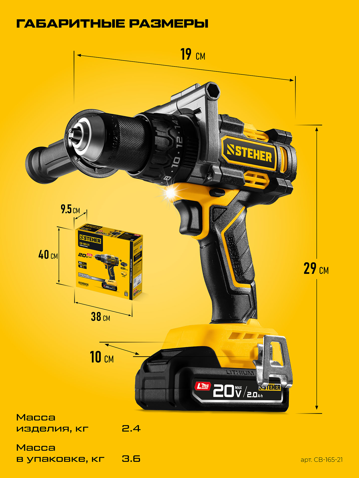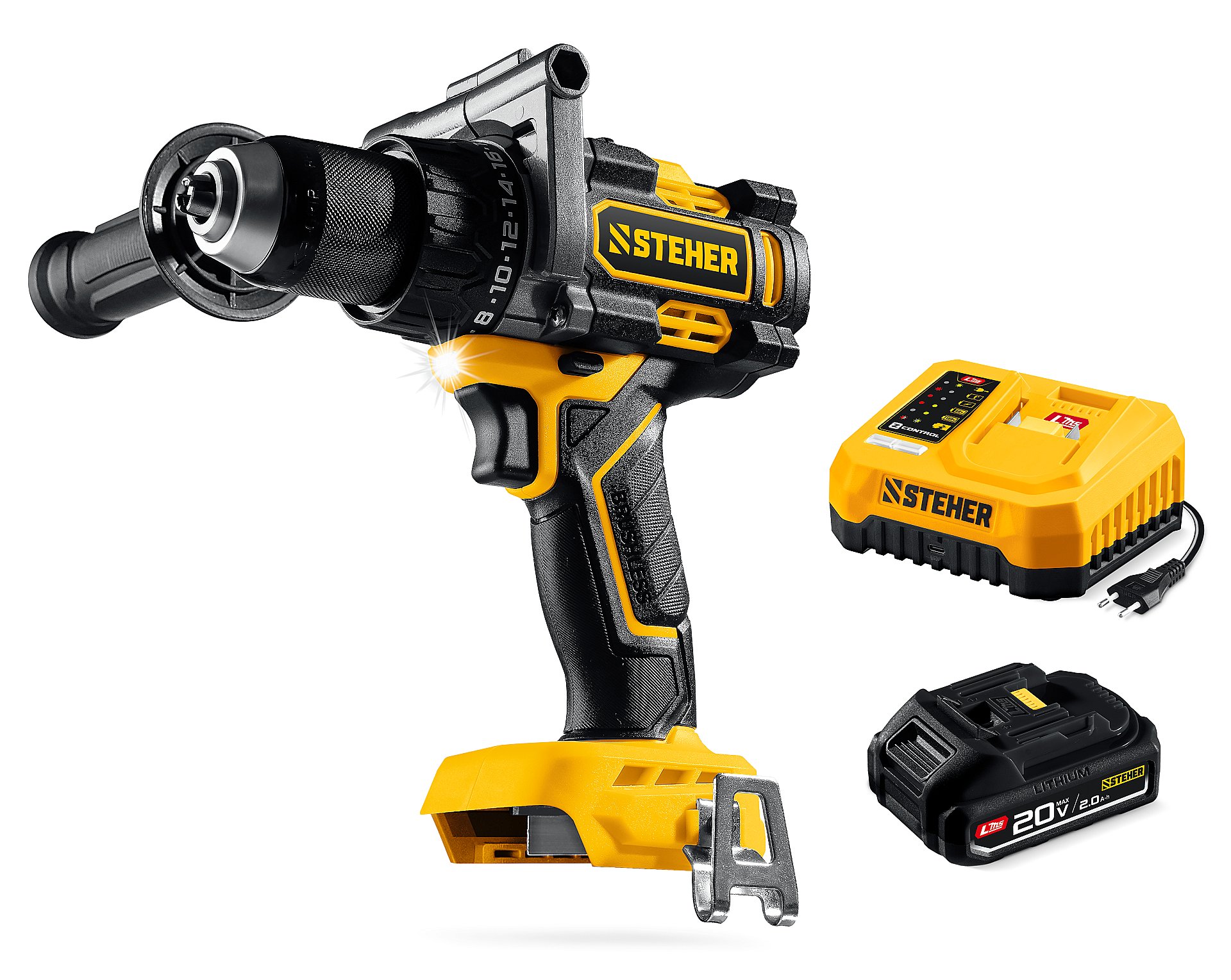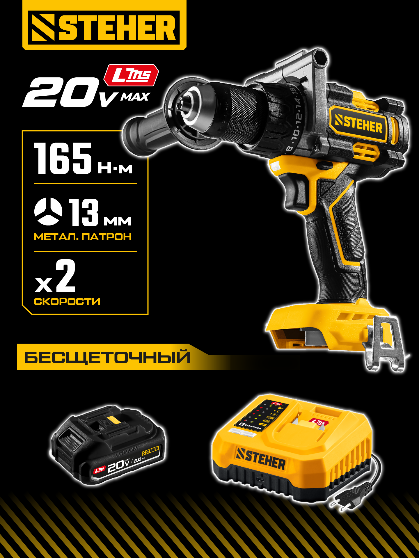 Бесщеточная дрель-шуруповерт STEHER системы LMS с максимальным крутящим моментом 165 Нм предназначена для работы с самым крупным крепежом (саморезы до 12 мм диаметром) и сверления отверстий до 40 мм в дереве. Встроенная защита от обратного удара предотвращает повреждение кисти при резкой блокировке вала. Комплектация с аккумулятором позволяет начать работу сразу после покупки