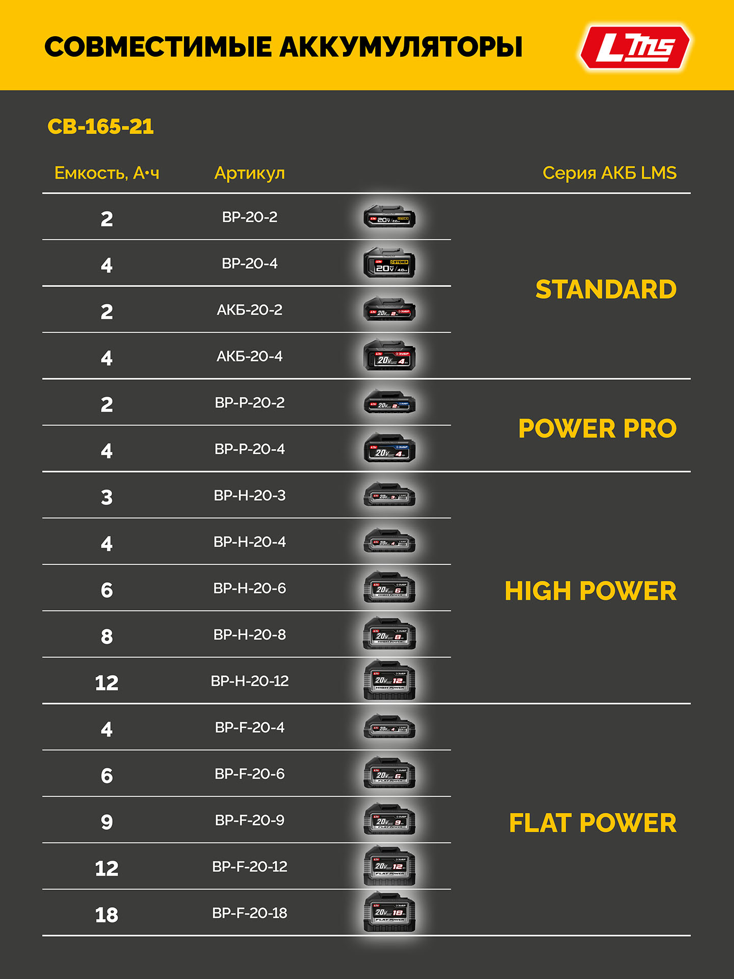 - Аккумулятор универсальной системы LMS повышенной емкости 2.0 А*ч позволяет инструменту работать дольше и эффективнее