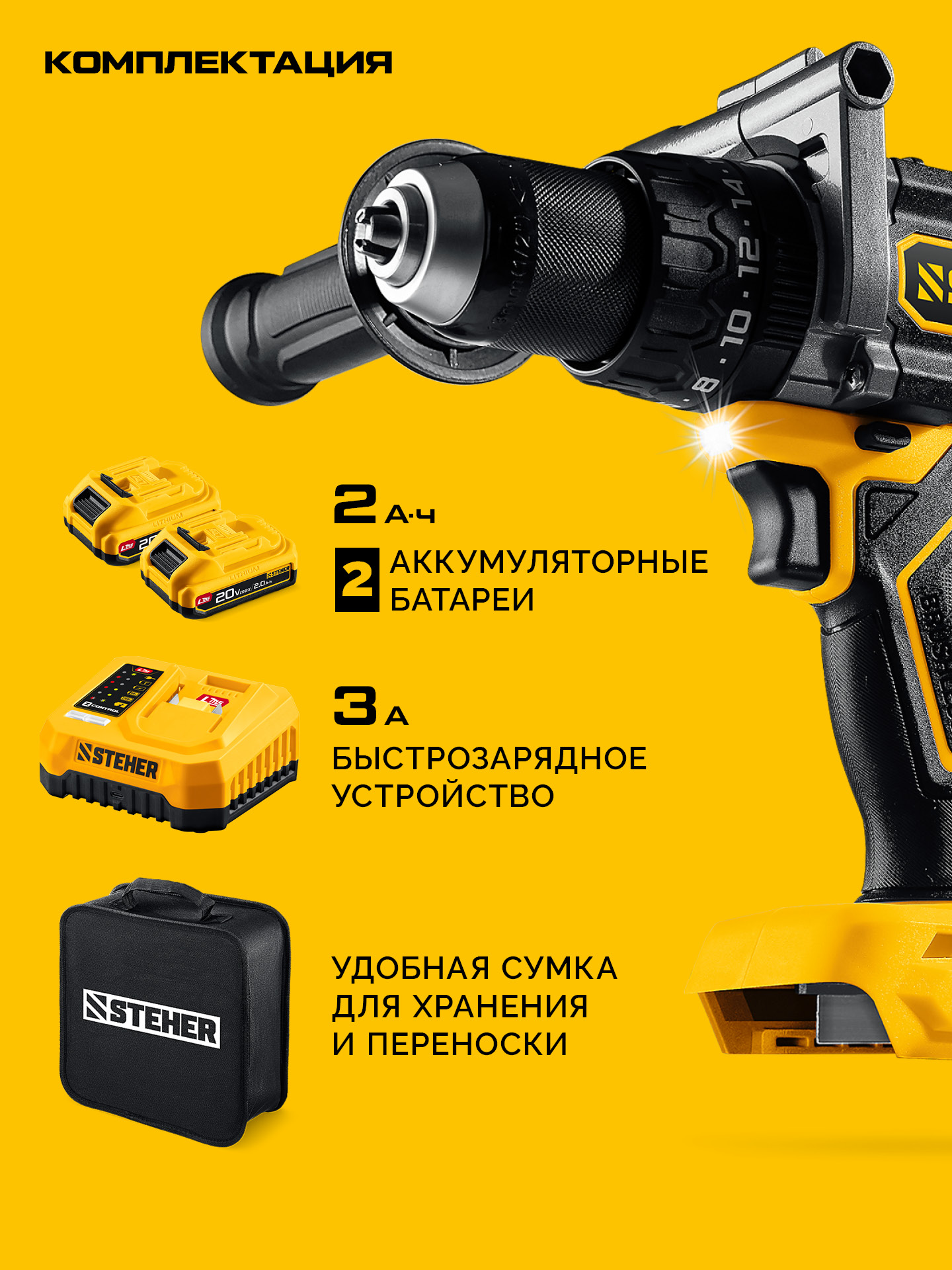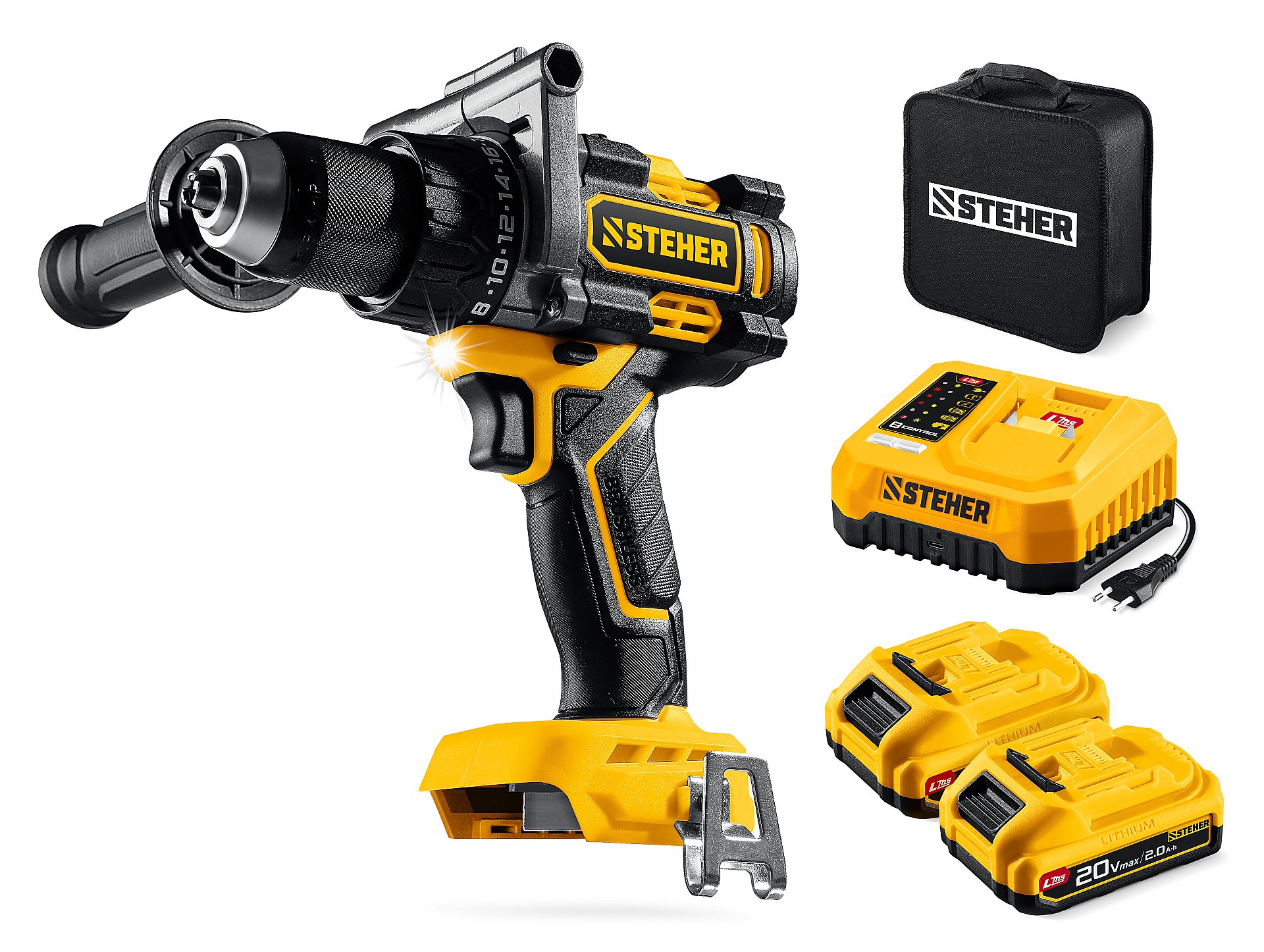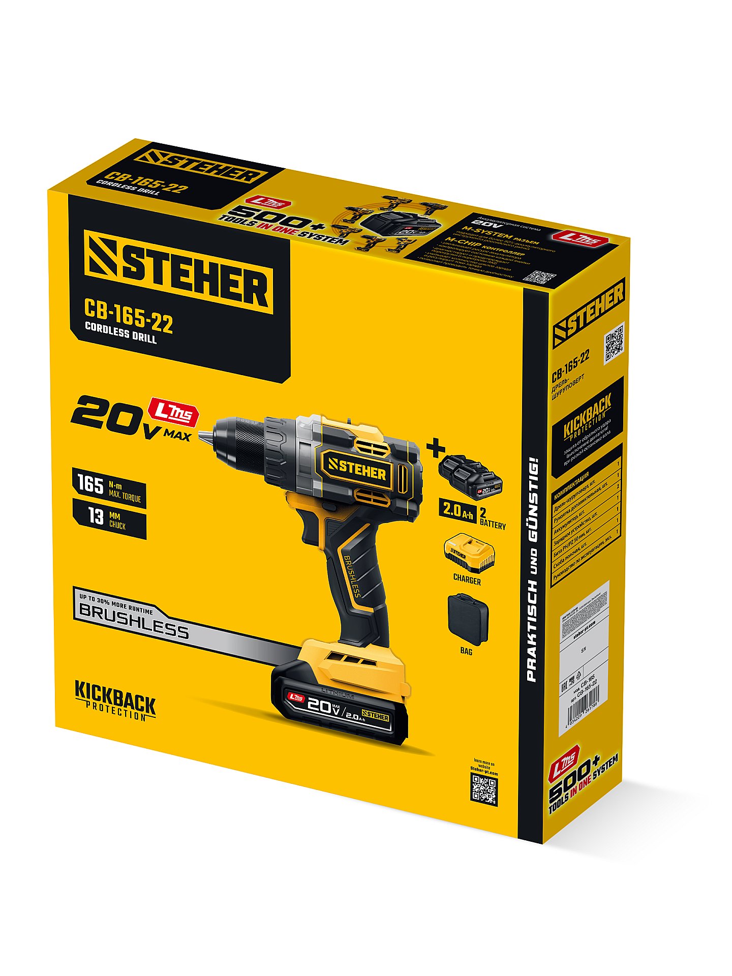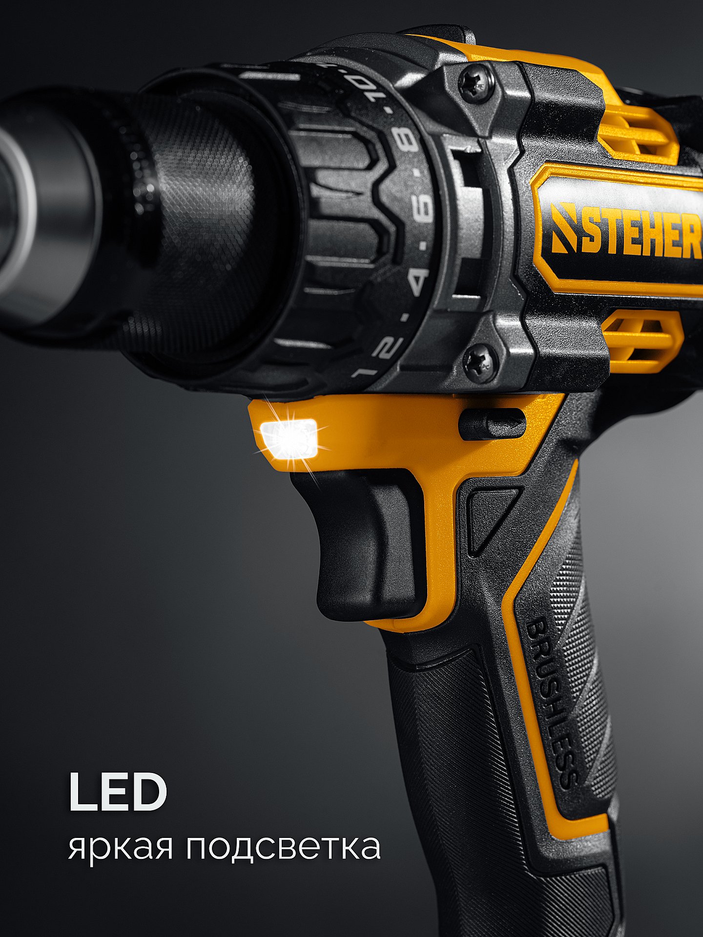 Бесщеточная дрель-шуруповерт STEHER системы LMS с максимальным крутящим моментом 165 Нм предназначена для работы с самым крупным крепежом (саморезы до 12 мм диаметром) и сверления отверстий до 40 мм в дереве. Встроенная защита от обратного удара предотвращает повреждение кисти при резкой блокировке вала. Комплектация с двумя аккумуляторами позволяет работать практически без остановки