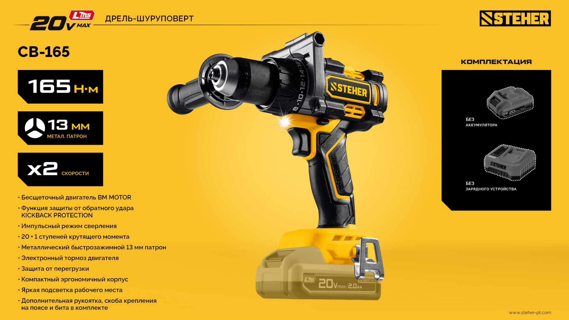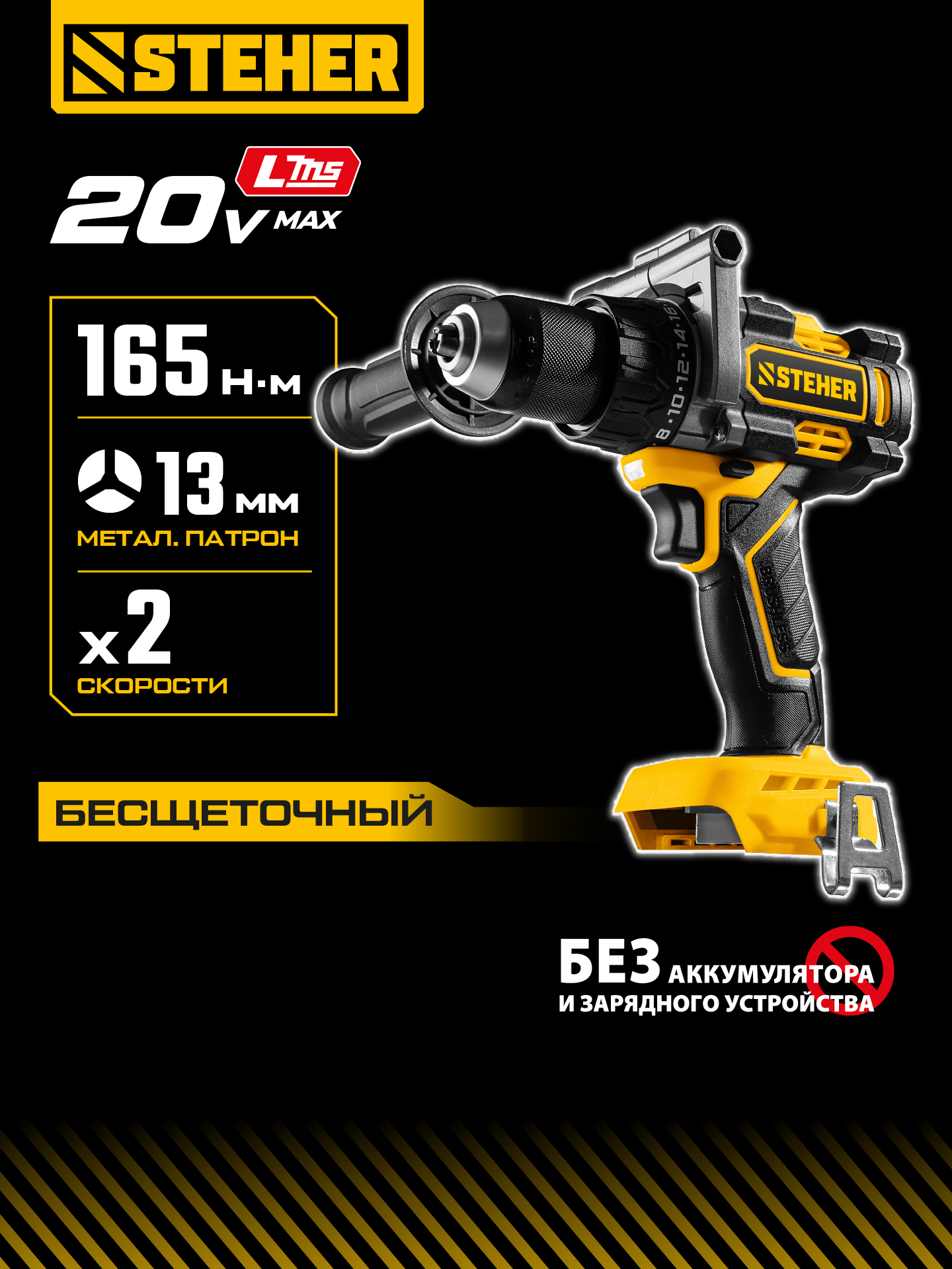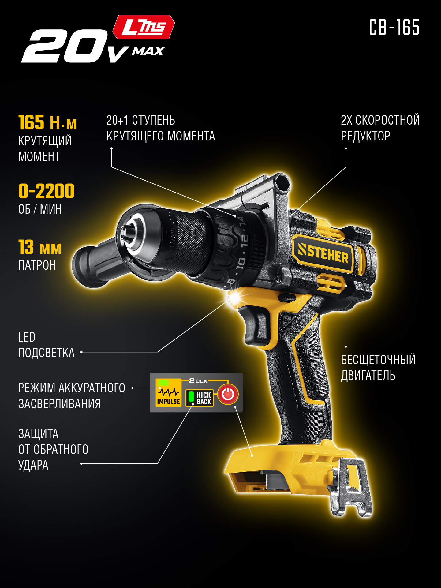 Бесщеточная дрель-шуруповерт STEHER системы LMS с максимальным крутящим моментом 165 Нм предназначена для работы с самым крупным крепежом (саморезы до 12 мм диаметром) и сверления отверстий до 40 мм в дереве. Встроенная защита от обратного удара предотвращает повреждение кисти при резкой блокировке вала
