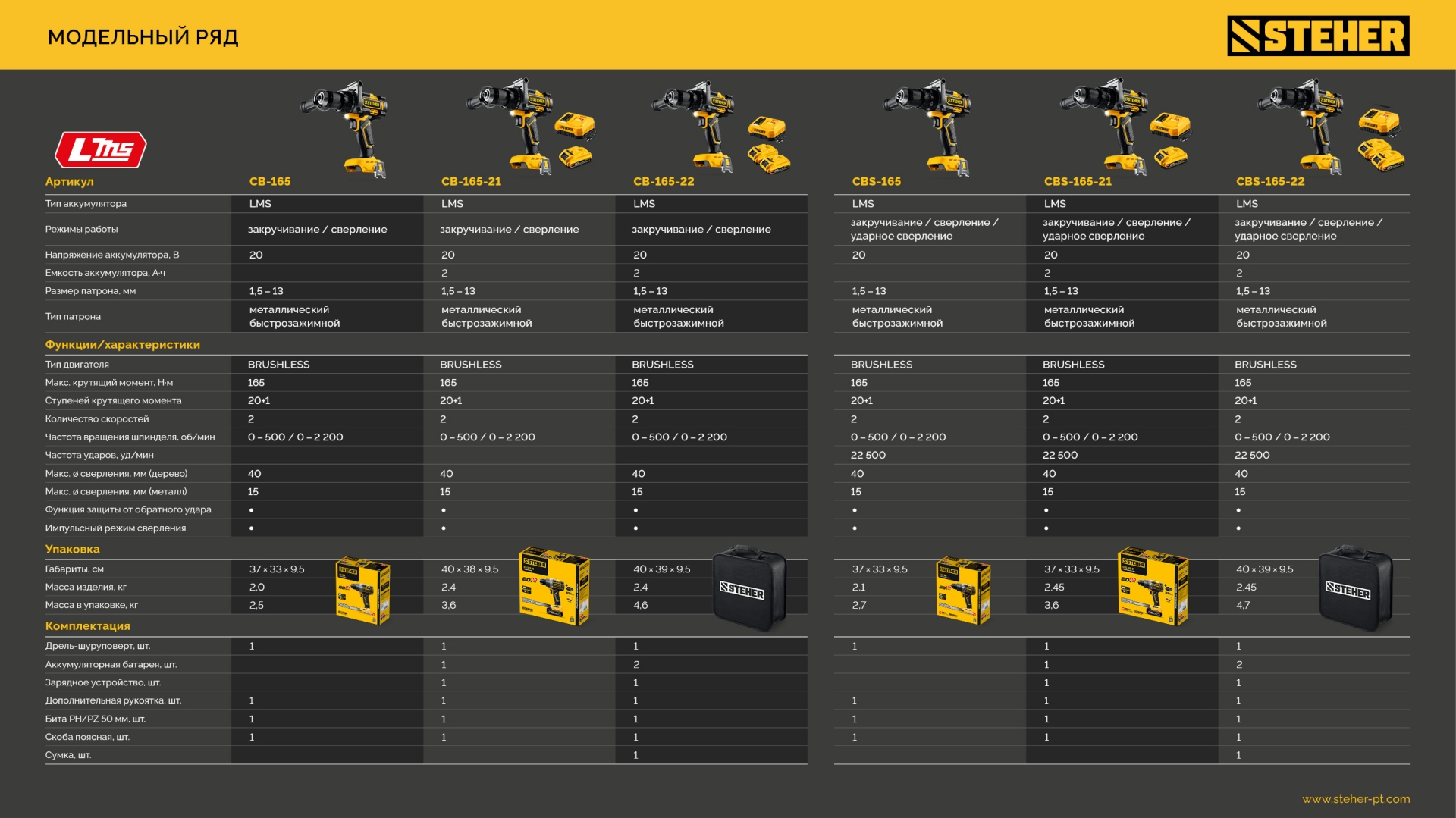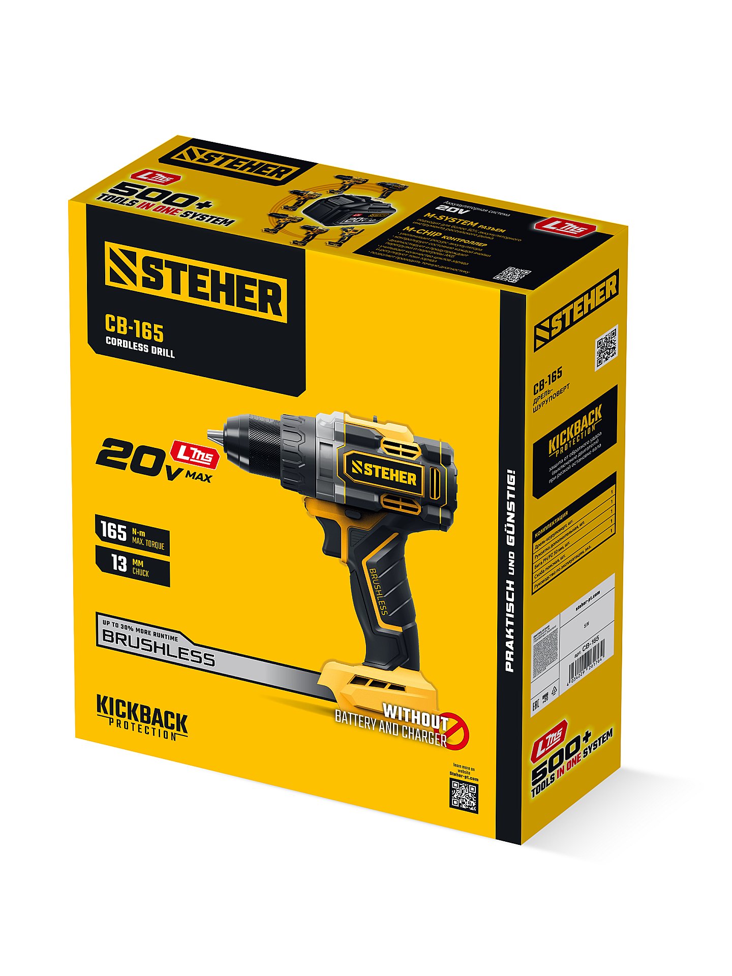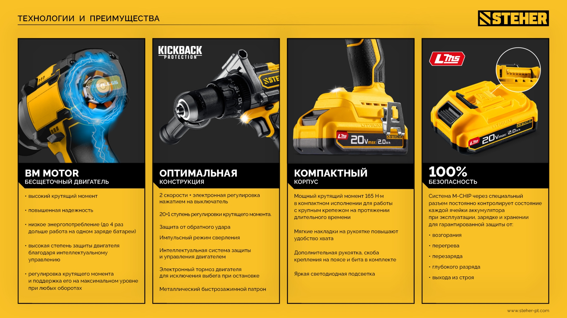 Бесщеточная дрель-шуруповерт STEHER системы LMS с максимальным крутящим моментом 165 Нм предназначена для работы с самым крупным крепежом (саморезы до 12 мм диаметром) и сверления отверстий до 40 мм в дереве. Встроенная защита от обратного удара предотвращает повреждение кисти при резкой блокировке вала