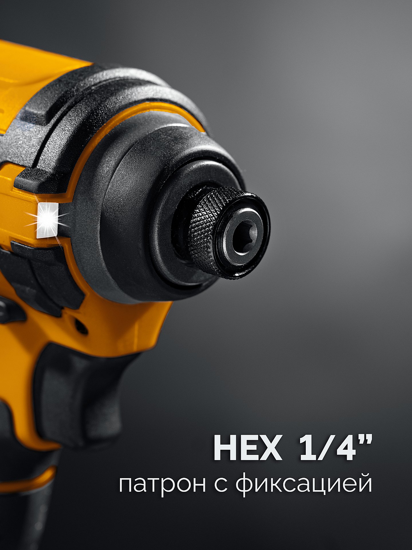 - Быстрозажимной патрон HEX 1/4'' с фиксатором позволяет устанавливать стандартные биты