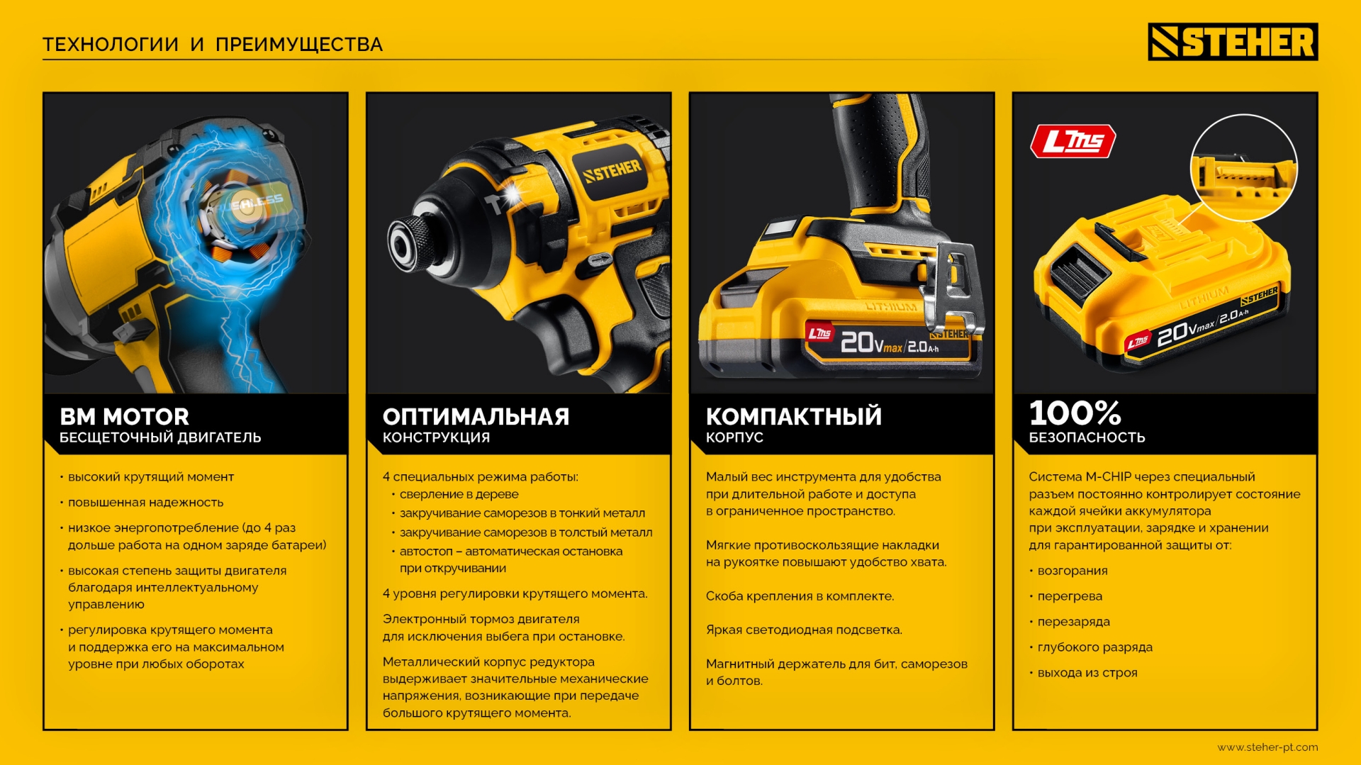 - повышенная надежность ввиду отсутствия искрения, трения и трущихся деталей, - Ударная функция позволяет заворачивать крепеж большого диаметра (глухари любого размера)
