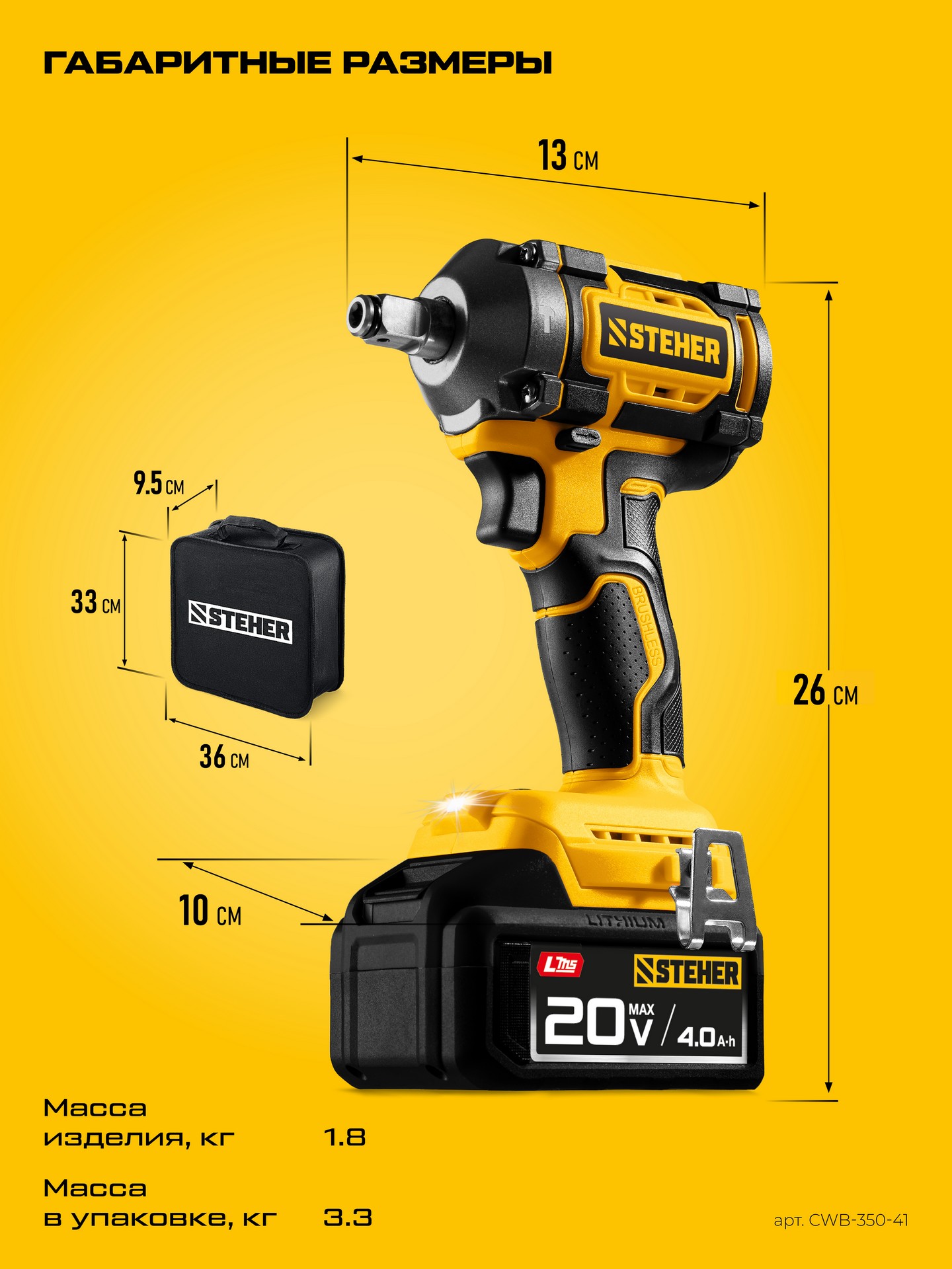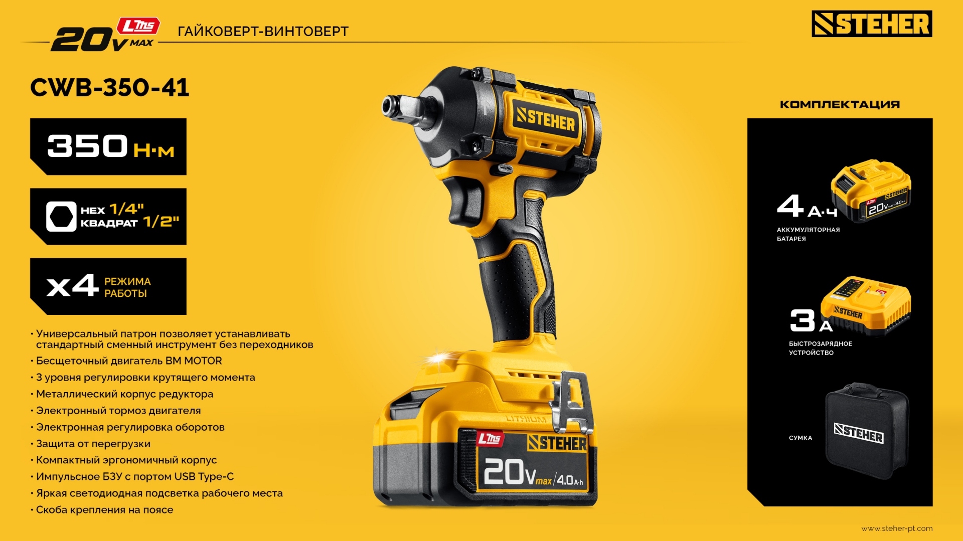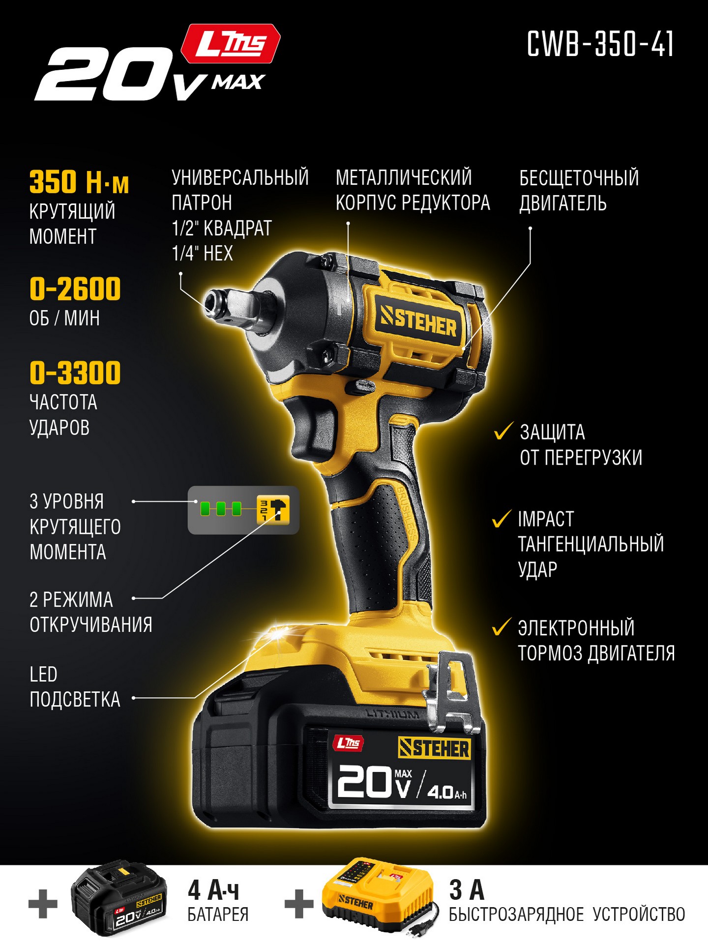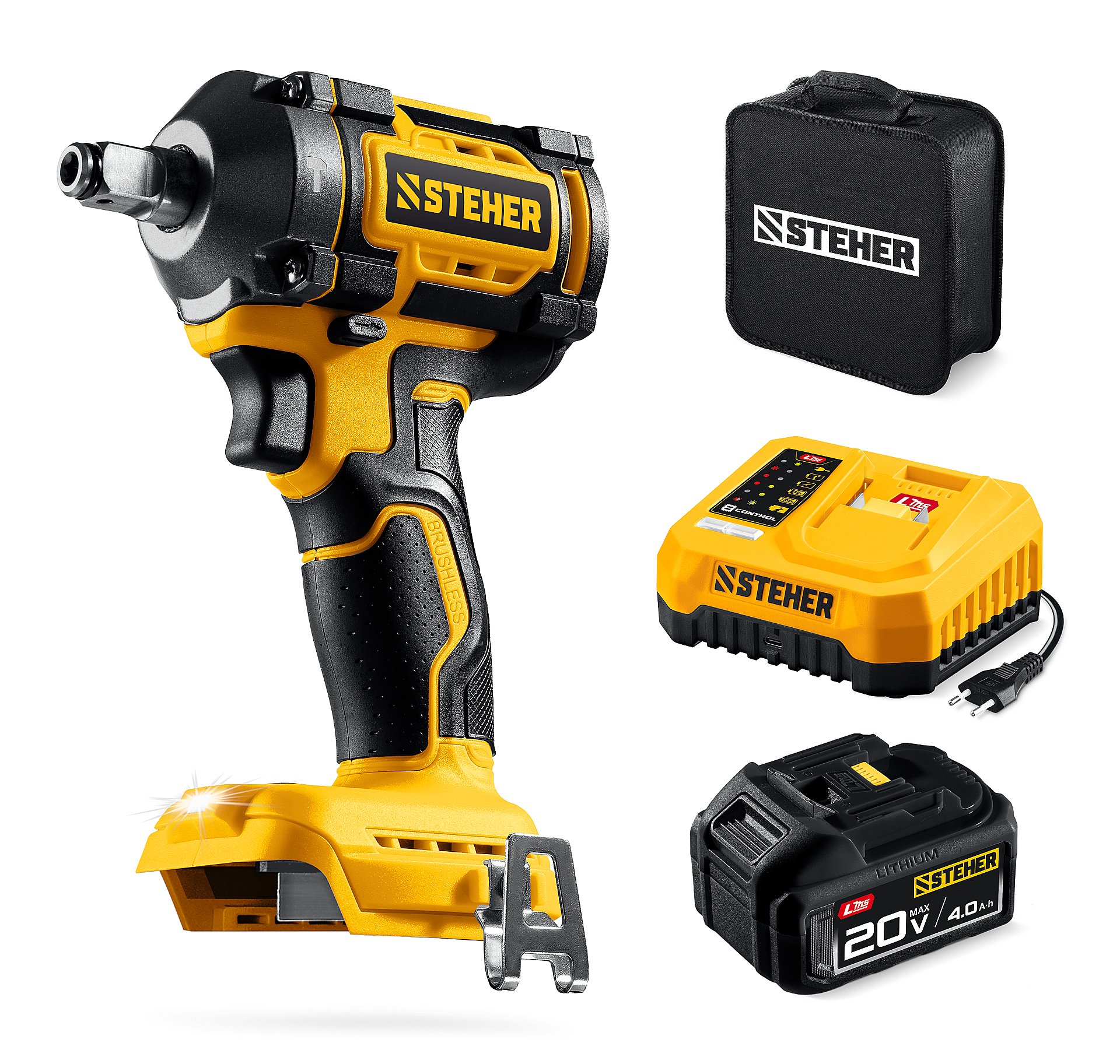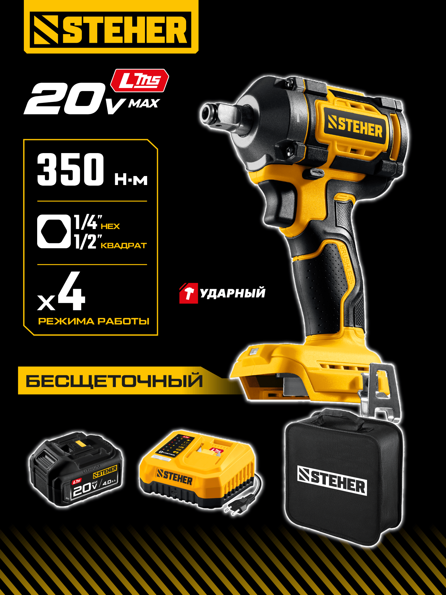 Бесщеточный ударный гайковерт Steher с BRUSHLESS двигателем и максимальным крутящим моментом 350 Н∙м предназначен для фиксации резьбовых соединений размером до М18. Ударная функция с эффективным направлением удара обеспечивает легкое заворачивание без лишней нагрузки на кисть оператора. Имеет современную аккумуляторную систему LMS с 1 АКБ в комлекте, совместимую с одним известным брендом.