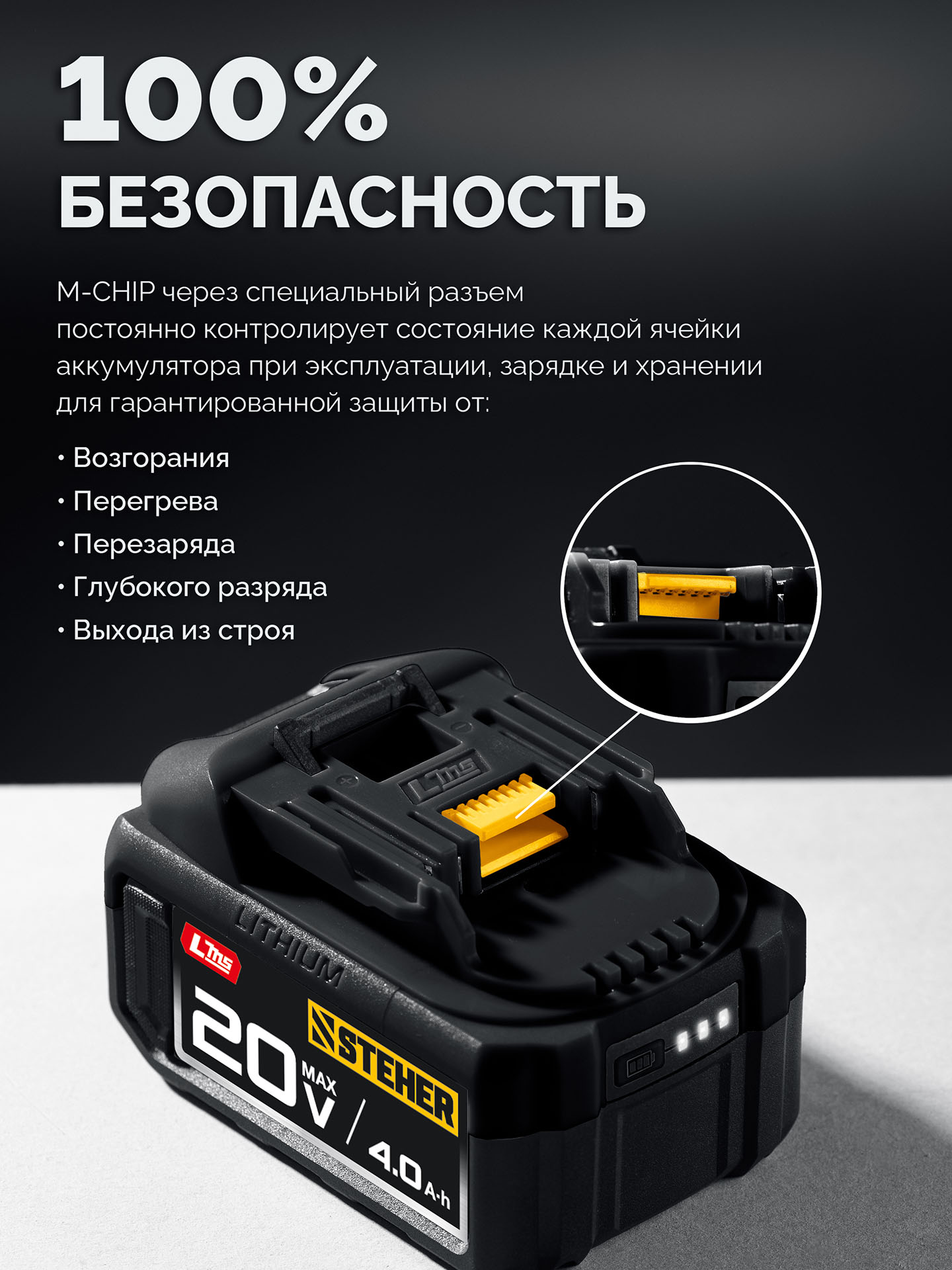 Аккумуляторная батарея для инструмента STEHER системы LMS позволит Вам работать еще дольше и производительнее. Усовершенствованная технология элементов обеспечивает повышенные удельные характеристики и длительный срок службы