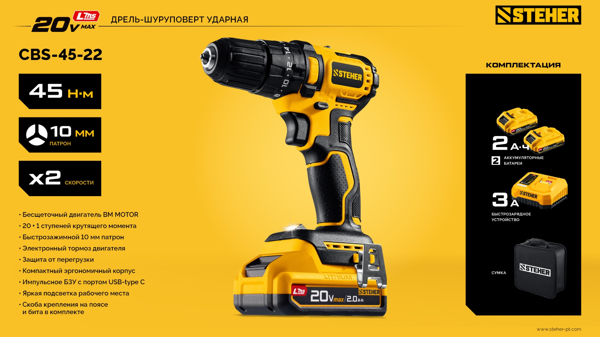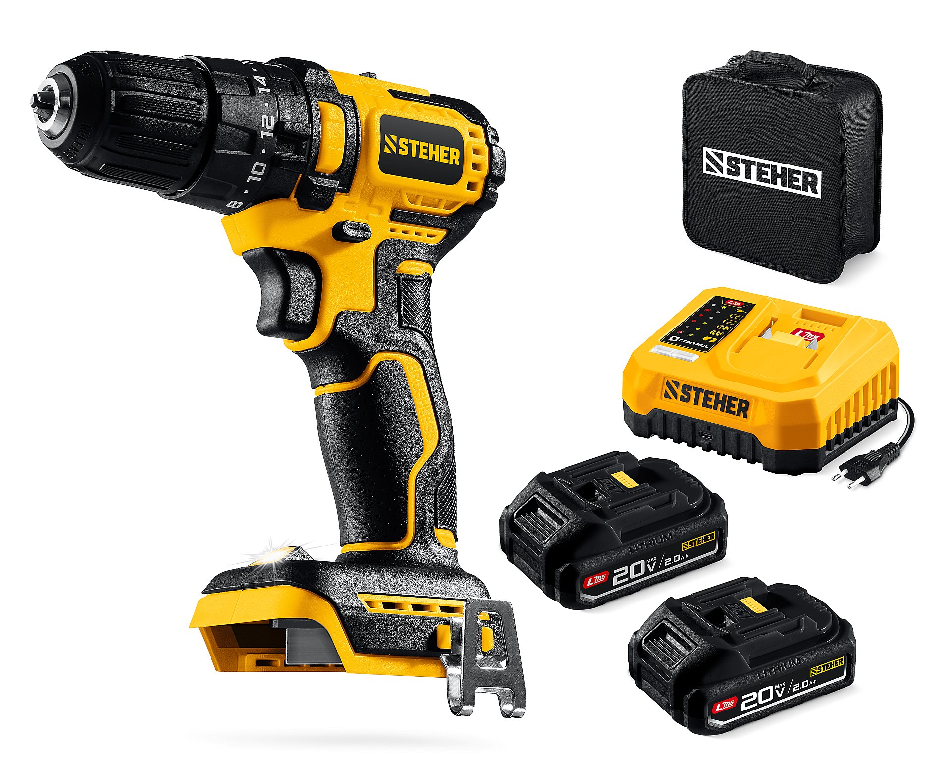 Бесщеточная дрель-шуруповерт ударная STEHER обеспечивает как точное заворачивание маленьких саморезов, так и уверенное закручивание крупного крепежа до 8мм. Компактный размер и современный дизайн делают ее удобной для работы. Комплектация с двумя аккумуляторами позволяет работать практически без остановки