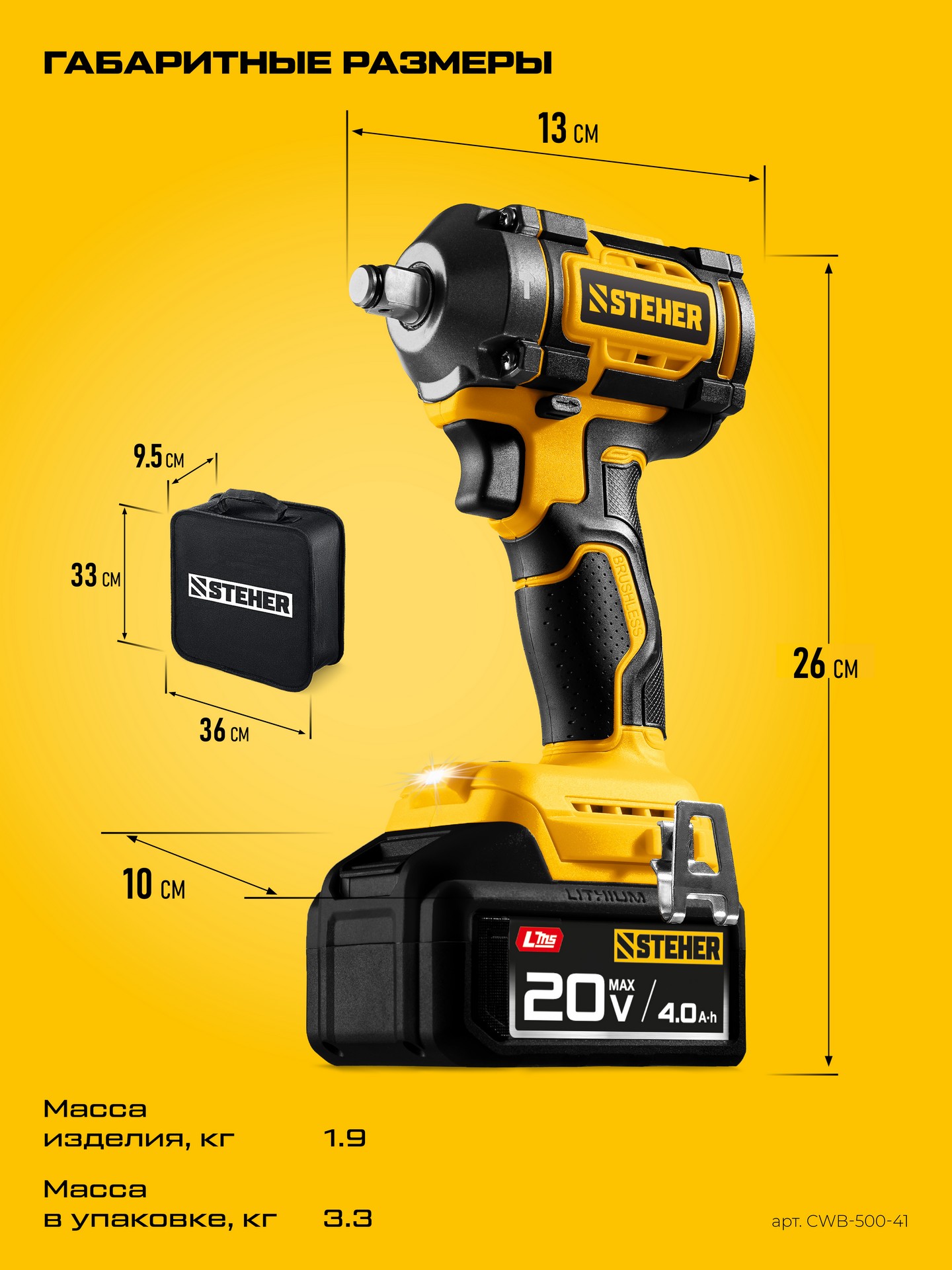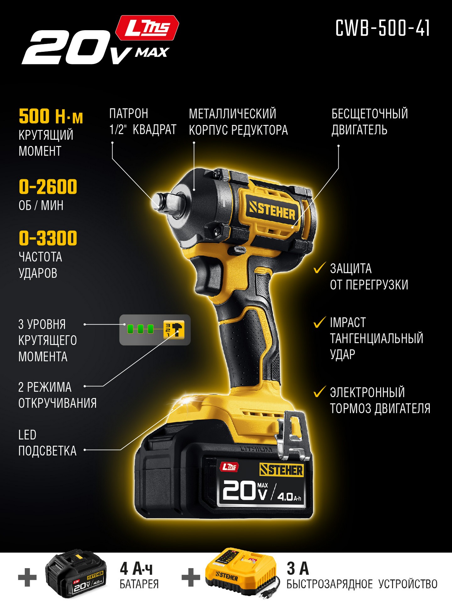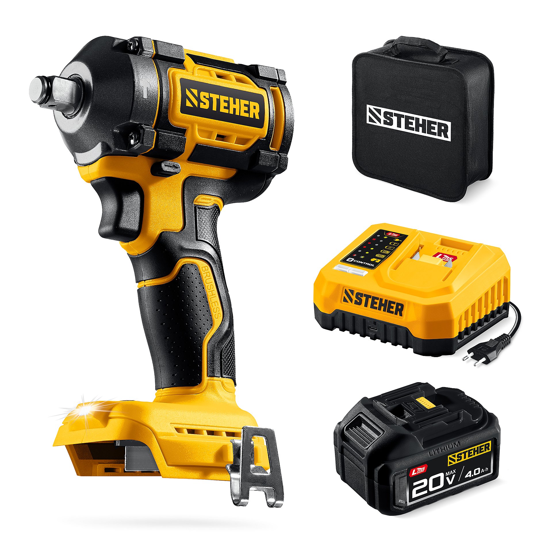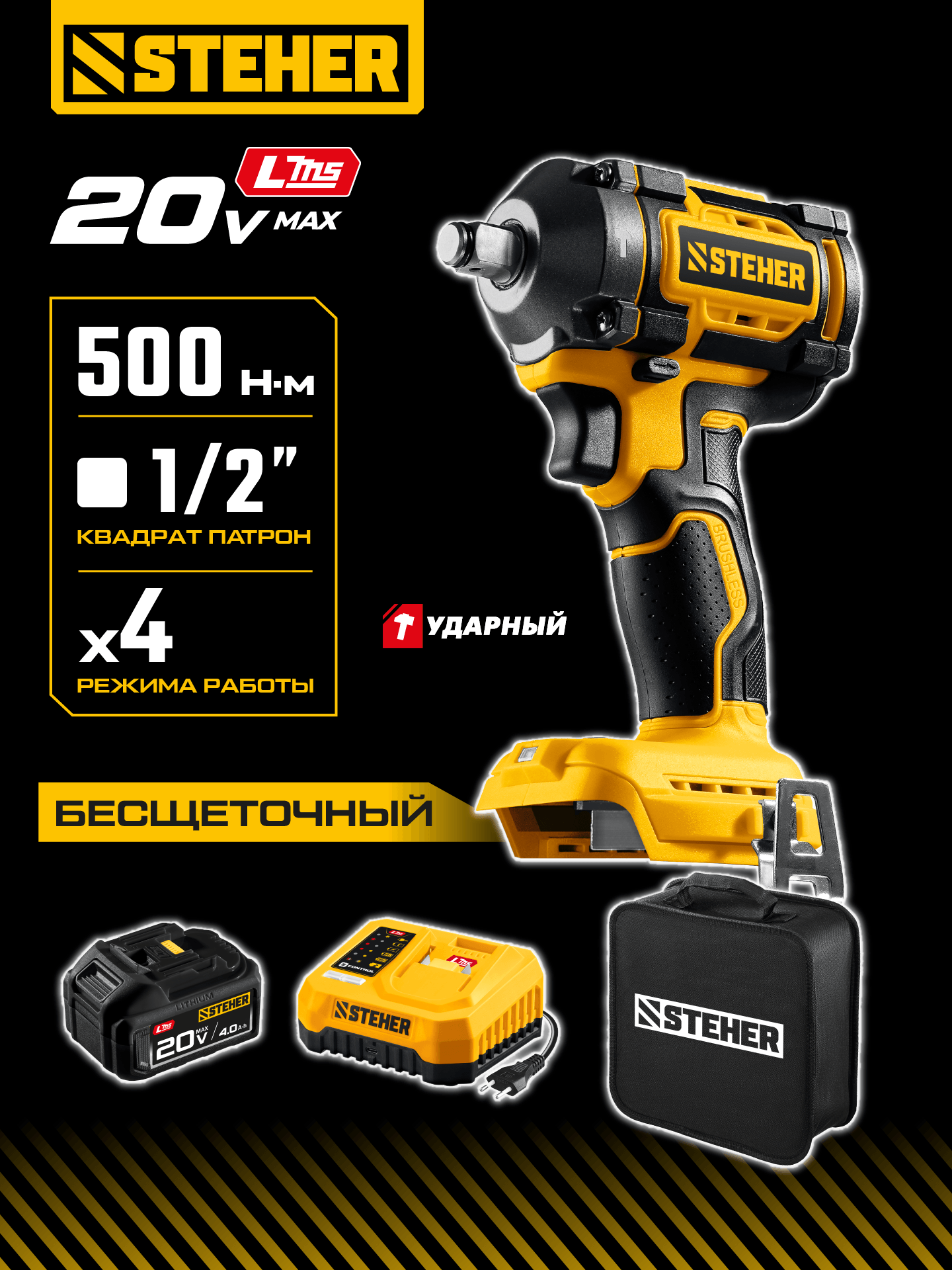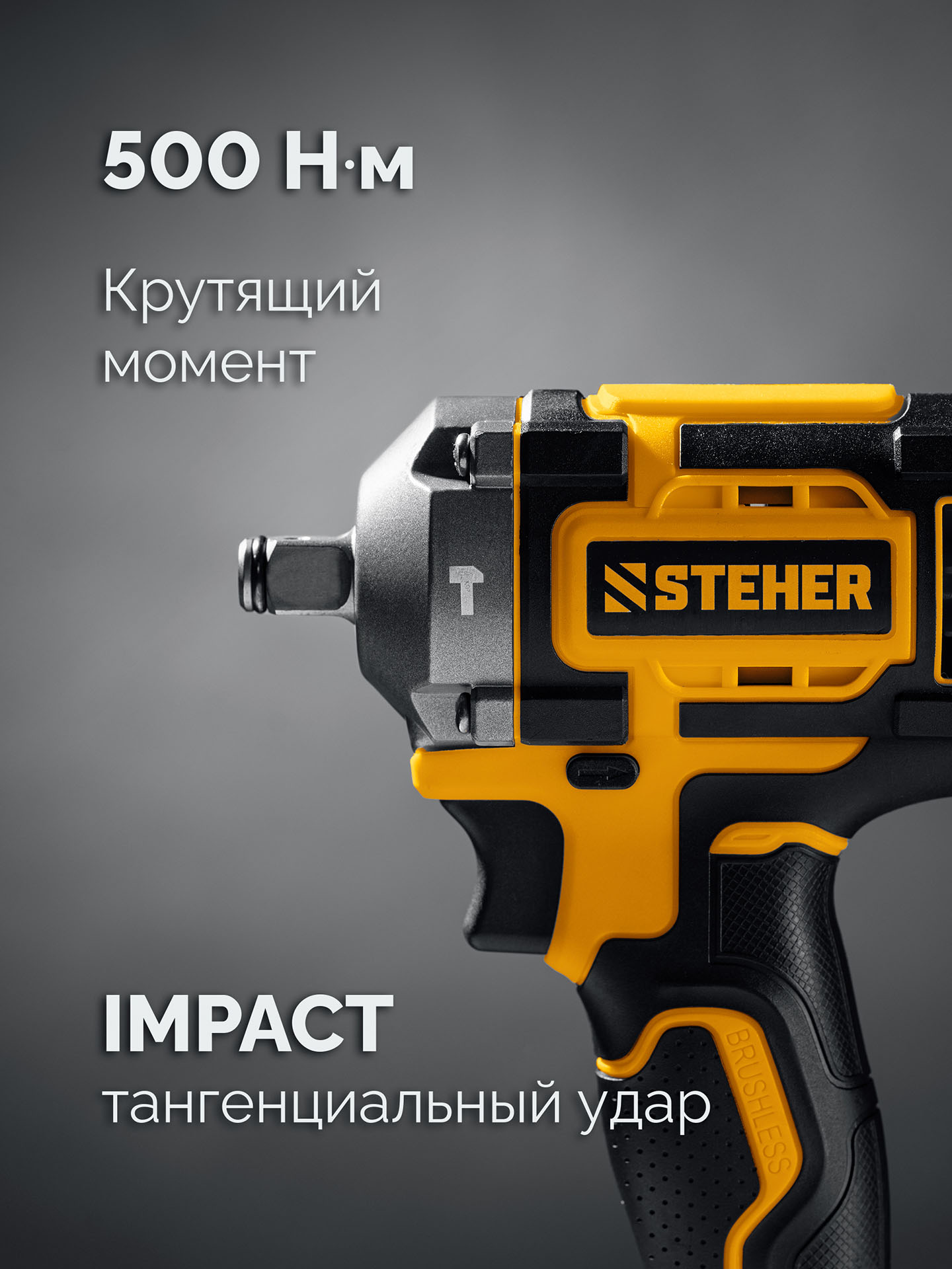 Бесщеточный ударный гайковерт Steher с BRUSHLESS двигателем и максимальным крутящим моментом 500 Н∙м предназначен для фиксации резьбовых соединений размером до М22. Ударная функция с эффективным направлением удара обеспечивает легкое заворачивание без лишней нагрузки на кисть оператора. Имеет современную аккумуляторную систему LMS с 1 АКБ в комлекте, совместимую с одним известным брендом.