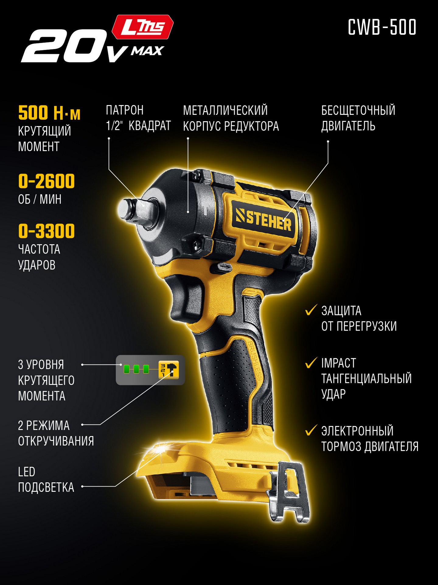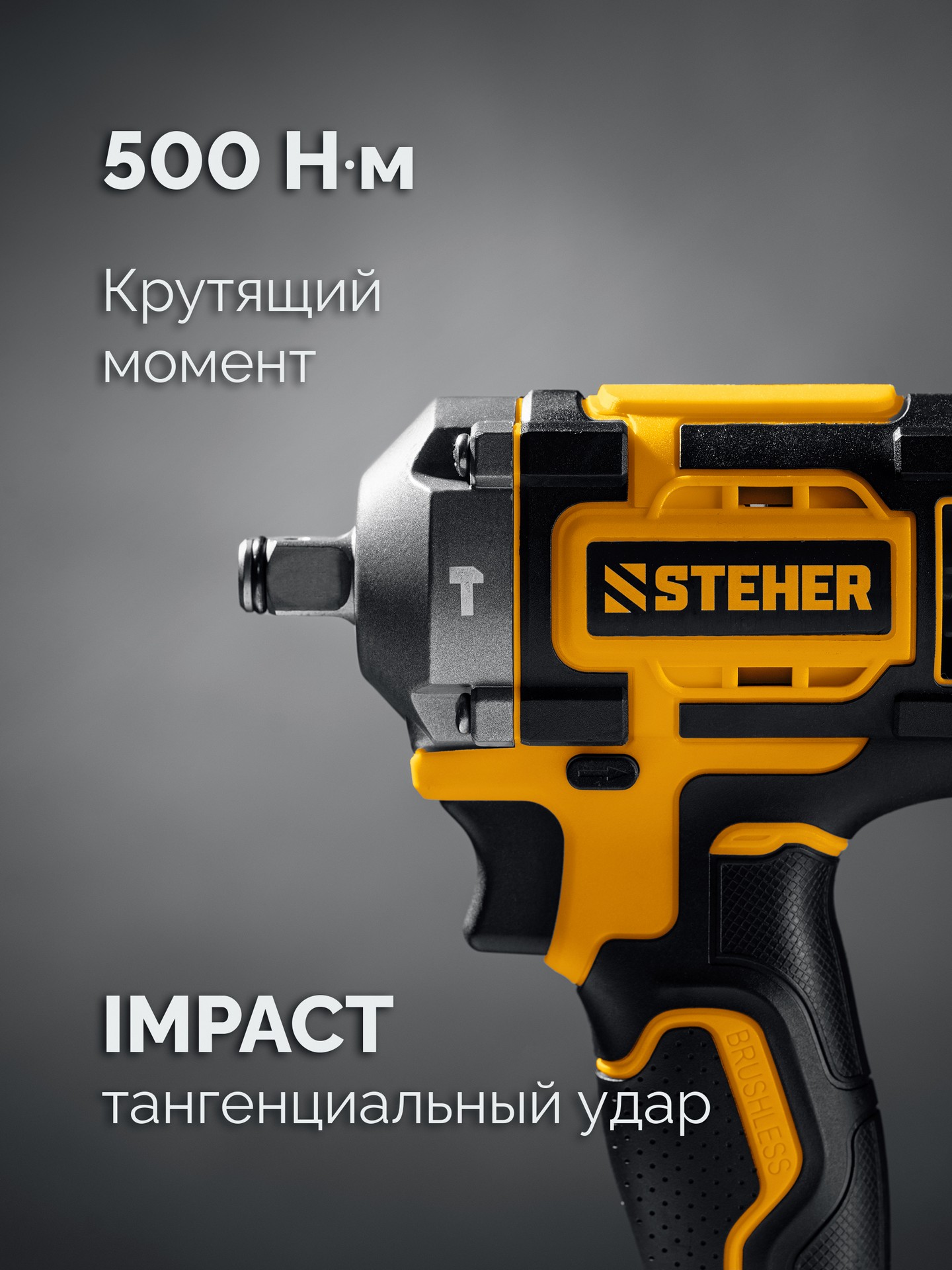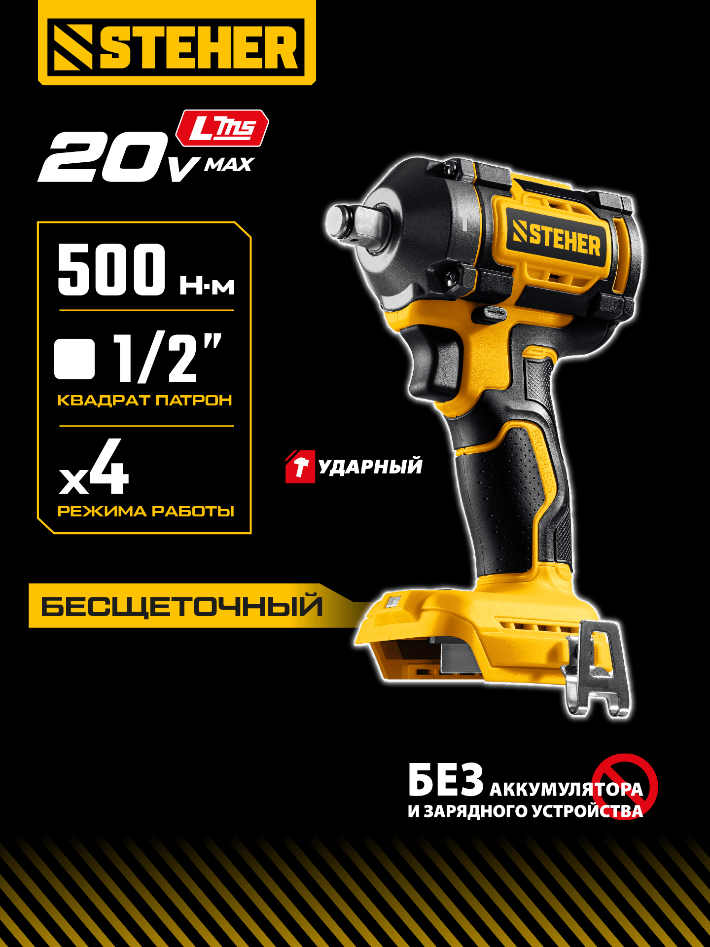 Бесщеточный ударный гайковерт Steher с BRUSHLESS двигателем и максимальным крутящим моментом 500 Н∙м предназначен для фиксации резьбовых соединений размером до М22. Ударная функция с эффективным направлением удара обеспечивает легкое заворачивание без лишней нагрузки на кисть оператора. Имеет современную аккумуляторную систему LMS с 1 АКБ в комлекте, совместимую с одним известным брендом
