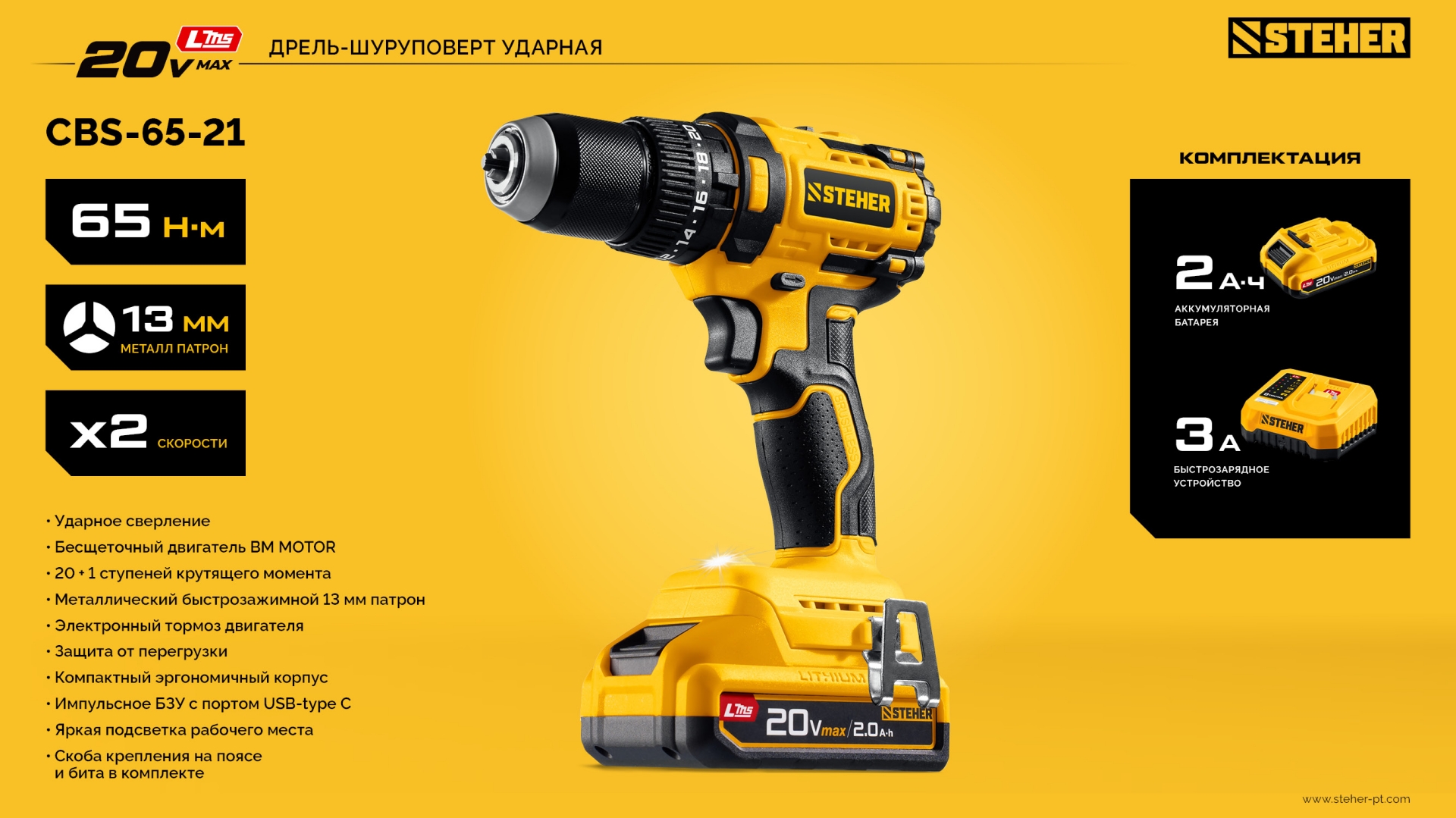 Бесщеточная дрель-шуруповерт STEHER системы LMS с увеличенным крутящим моментом предназначена для быстрого заворачивания саморезов до 8 мм диаметром и сверления отверстий до 30 мм в дереве. Длительная работа от одного заряда обеспечивается эффективным двигателем BRUSHLESS
