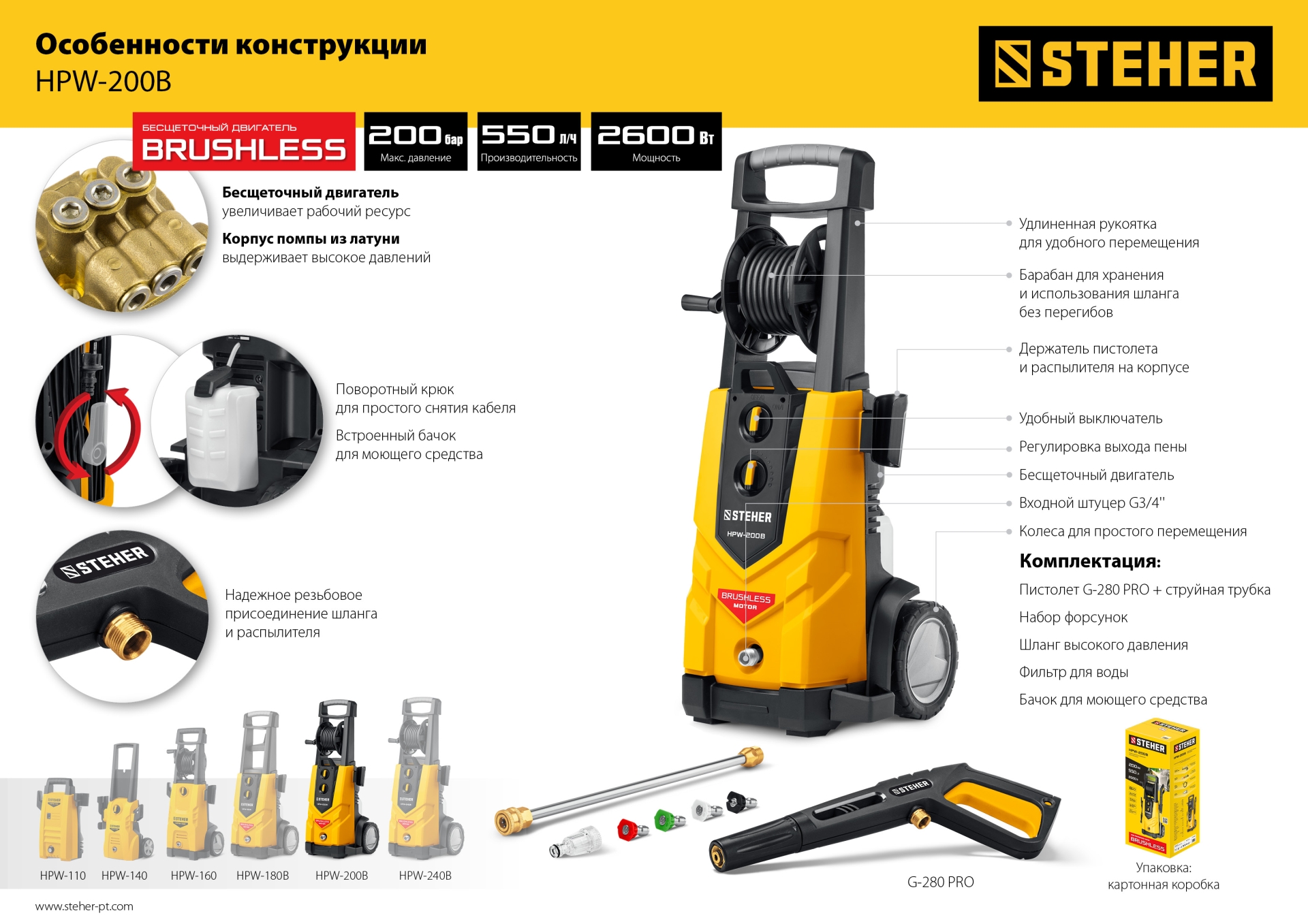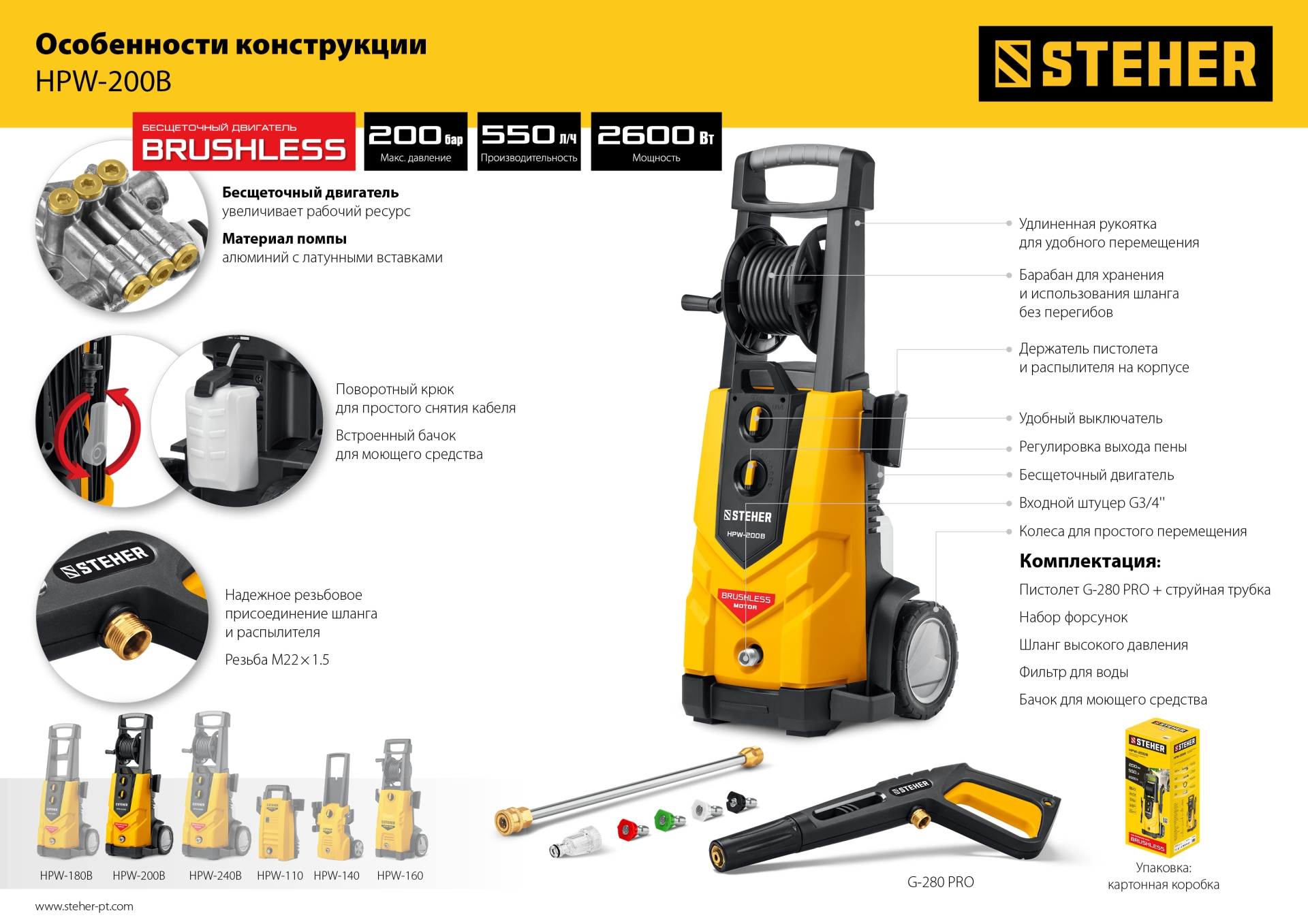 Профессиональные мойки высокого давления, оснащенные бесщеточным двигателем с низкими оборотами и высоким крутящим моментом, используются как для бытовых нужд, так и в сфере клининга или на профессиональной автомойке. Благодаря системе полной остановки, помпа не работает при ненажатом пистолете – это экономит воду и ресурс изделия при неизбежных паузах в работе. Элегантный дизайн и удобная конструкция с держателями для аксессуаров делают работу с изделием комфортной. Регулировка давления и формы выходной струи позволяет обрабатывать различные поверхности - автомобили, стены, велосипеды, напольные покрытия и т.п.