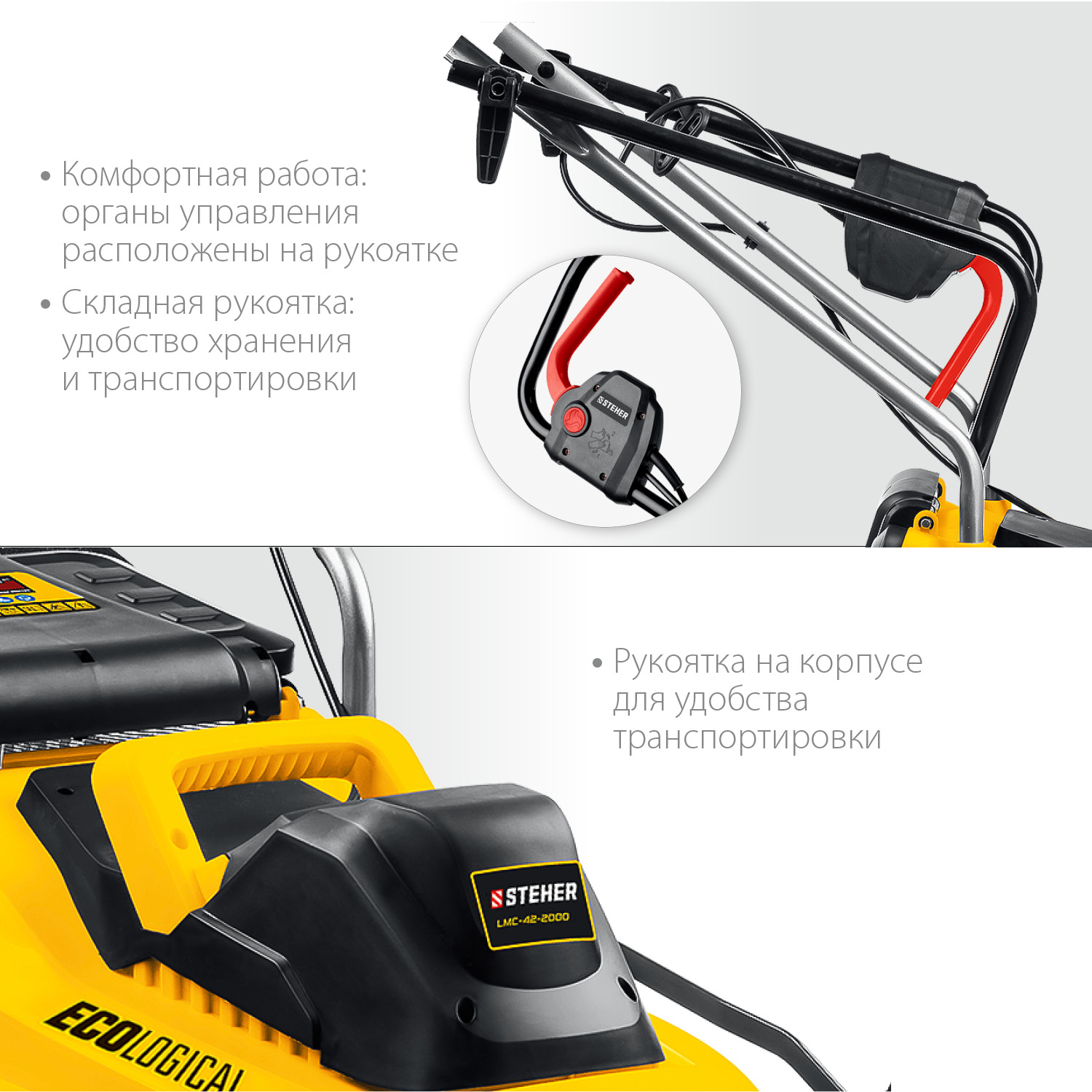 - Органы управления расположены на регулируемой по высоте рукоятке, что повышает удобство и безопасность работы