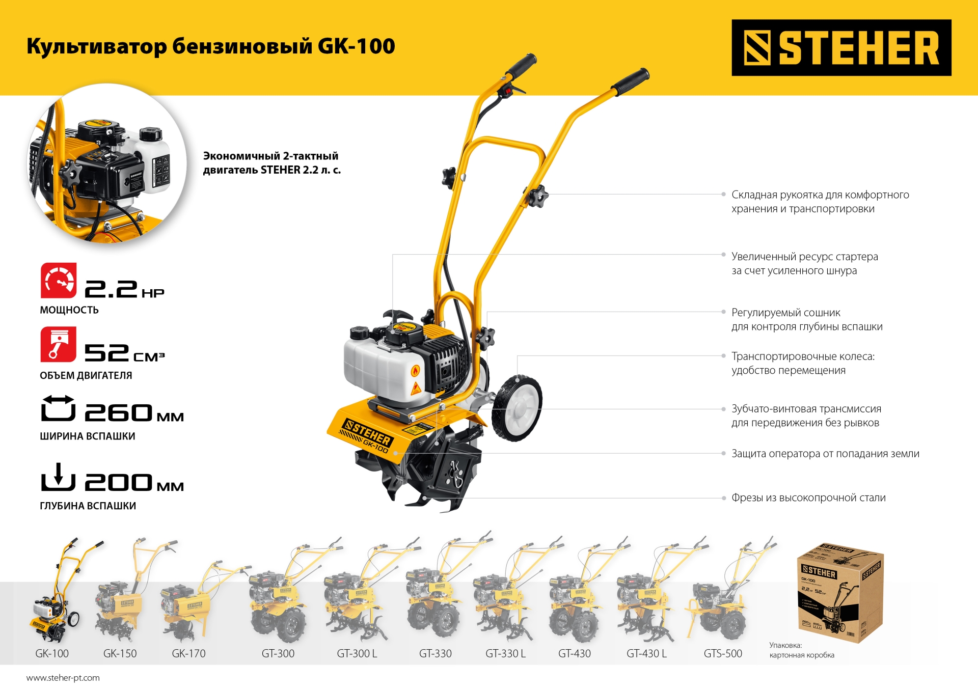 Лёгкий и манёвренный культиватор с двухтактным двигателем для рыхления и культивации почвы на приусадебном участке. Сошник позволяет контролировать величину заглубления. Складная рукоятка и транспортные колеса облегчают эксплуатацию, транспортировку и хранение.