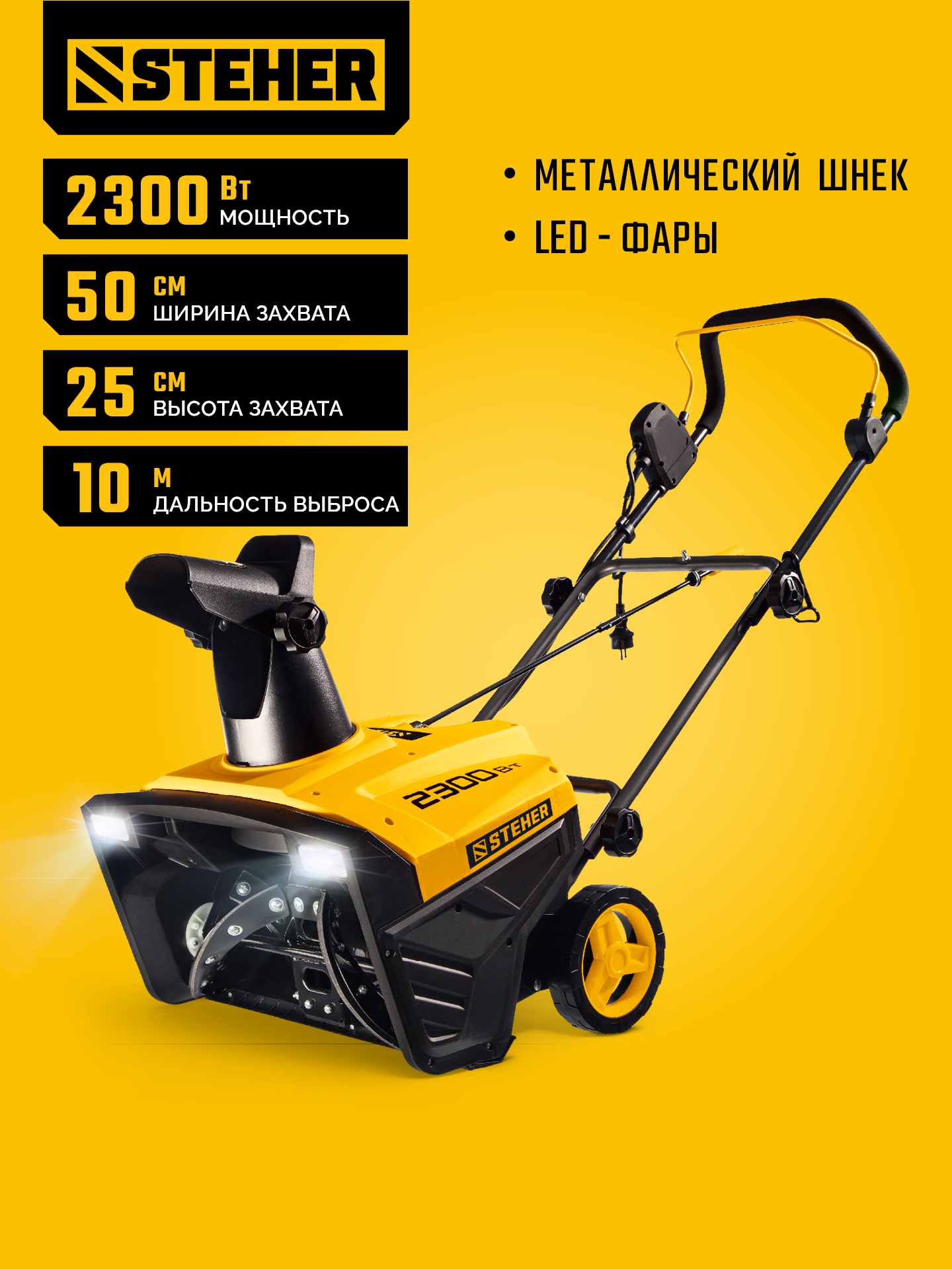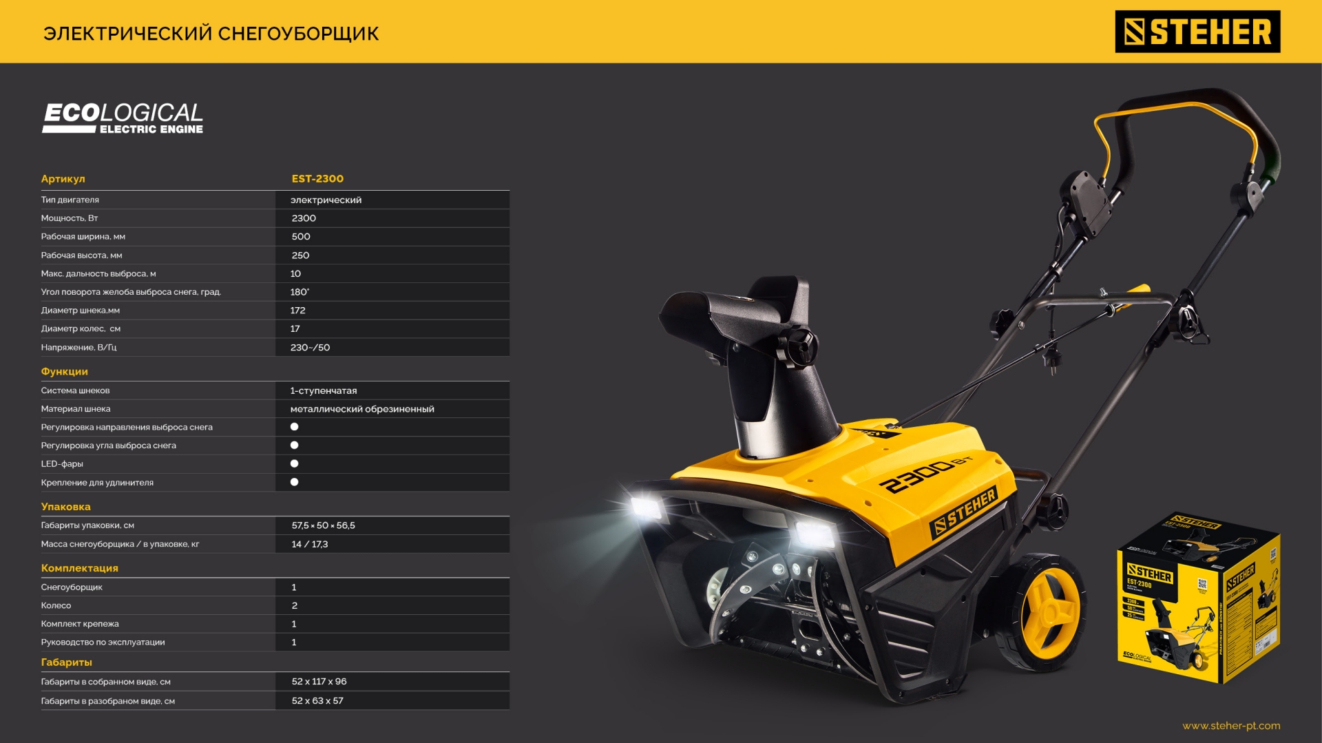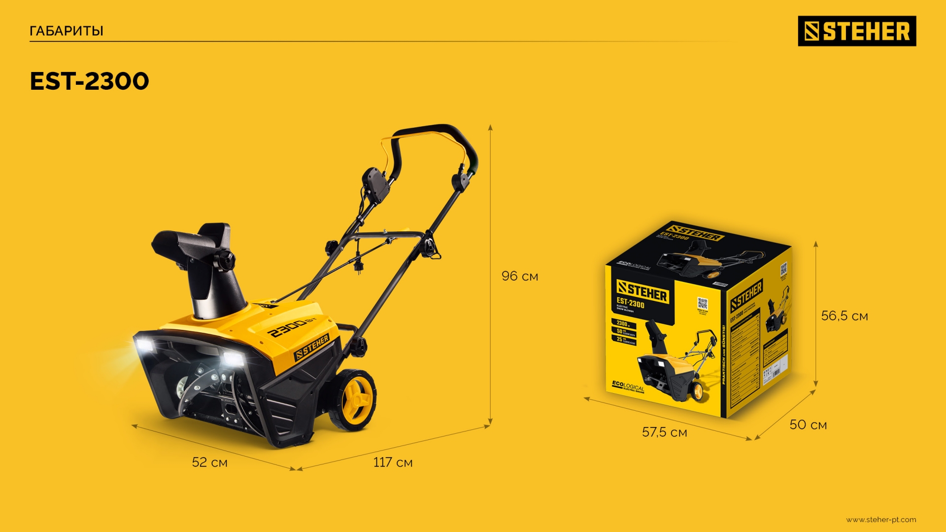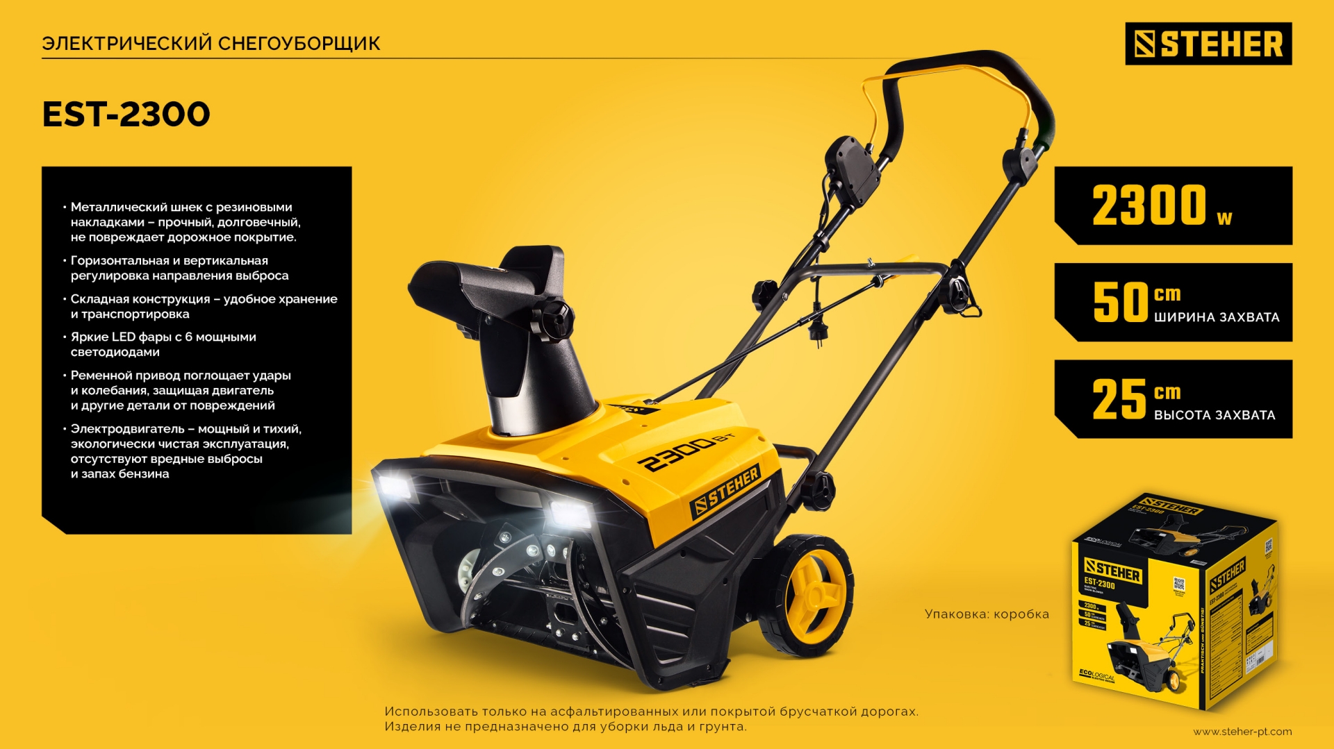 Мощный электрический снегоуборщик STEHER разработан для быстрой и эффективной уборки придомовых территорий, путей подъезда и пешеходных дорожек.