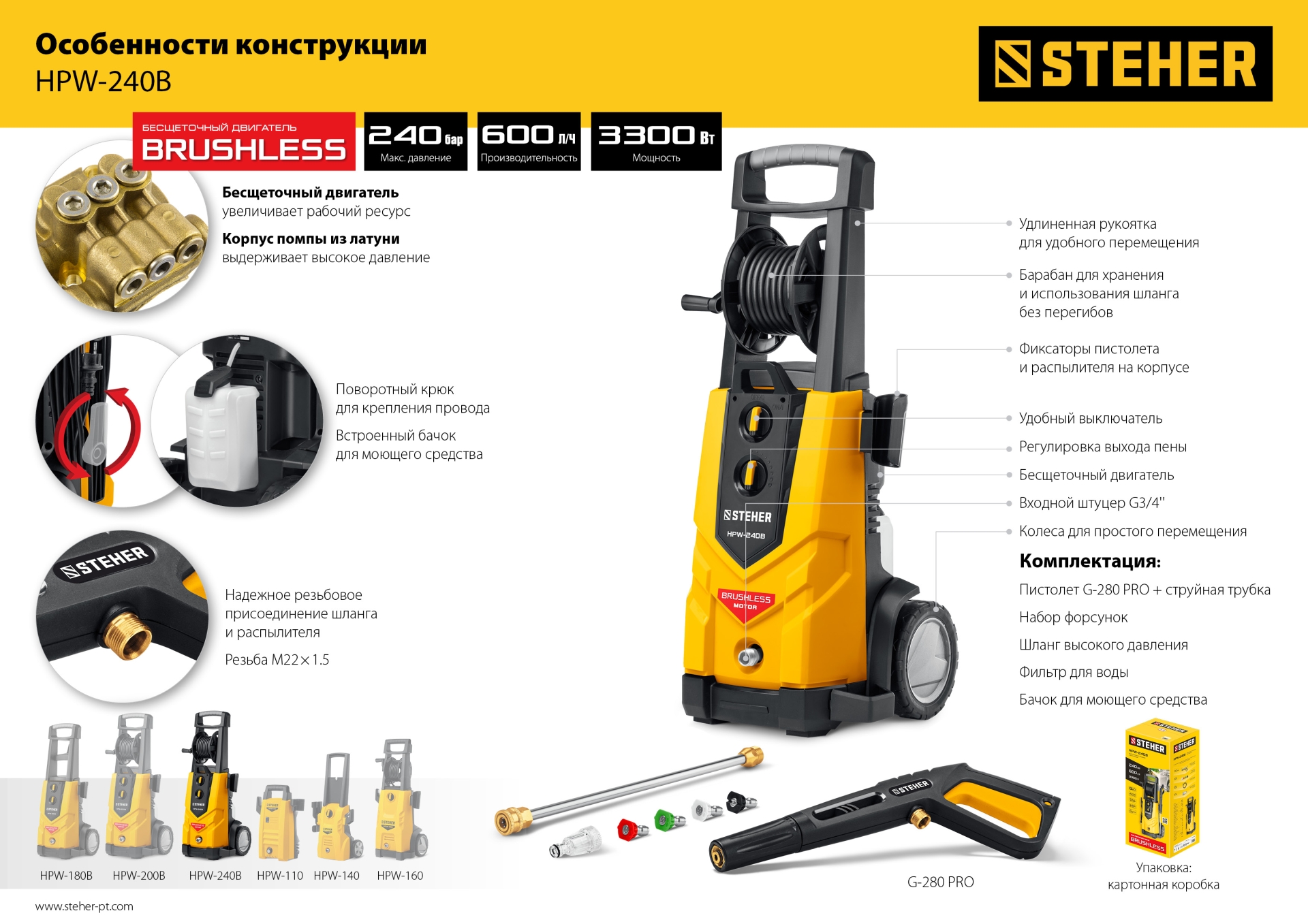Профессиональные мойки высокого давления, оснащенные бесщеточным двигателем с низкими оборотами и высоким крутящим моментом, используются как для бытовых нужд, так и в сфере клининга или на профессиональной автомойке. Благодаря системе полной остановки, помпа не работает при ненажатом пистолете – это экономит воду и ресурс изделия при неизбежных паузах в работе. Элегантный дизайн и удобная конструкция с держателями для аксессуаров делают работу с изделием комфортной. Регулировка давления и формы выходной струи позволяет обрабатывать различные поверхности - автомобили, стены, велосипеды, напольные покрытия и т.п.