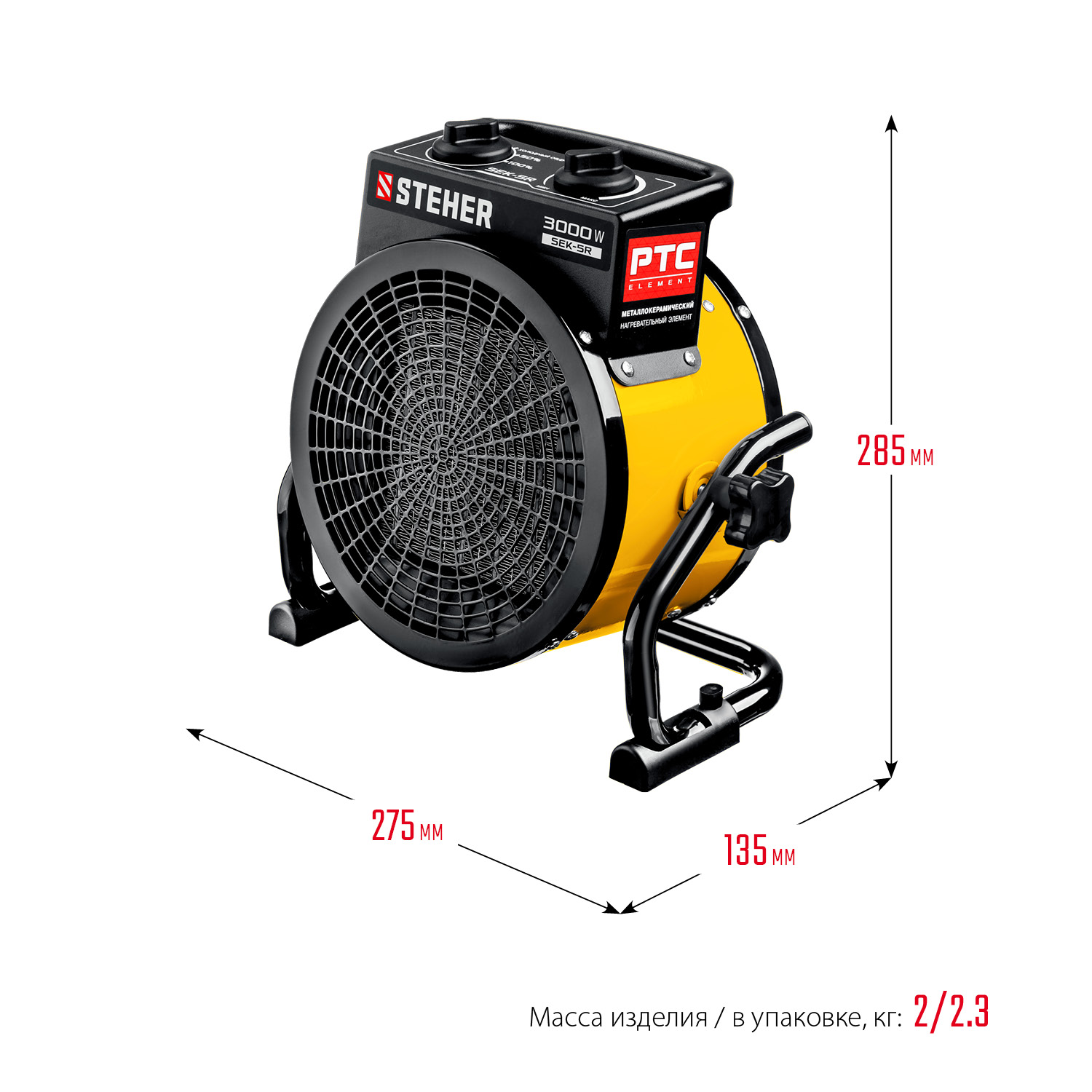 Электрические тепловые пушки STEHER серии SEK – компактные пушки в круглом корпусе для обогрева небольших помещений. Благодаря небольшим размерам тепловую пушку легко переносить и хранить. Устройства оснащены долговечным металлокерамическим нагревательный элементом,обеспечивающий быстрый равномерный нагрев, экономное потребление электроэнеергии и не сушит воздух. Механический терморегулятор поддерживает нужную температуру нагрева.За счет большой площади теплообмена и небольшой температуры нагрева элемента, воздух быстро прогревается. Изделие можно оставлять на долгое время и не бояться за сохранность помещения, так как конструктивные меры безопасности защищают Вас и изделие при нештатных ситуациях.