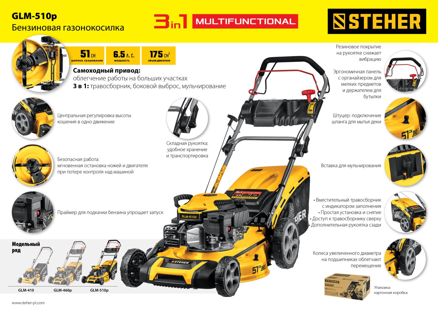 - Широкий диапазон и многоступенчатая центральная регулировка высоты кошения расширяют возможности применения газонокосилки