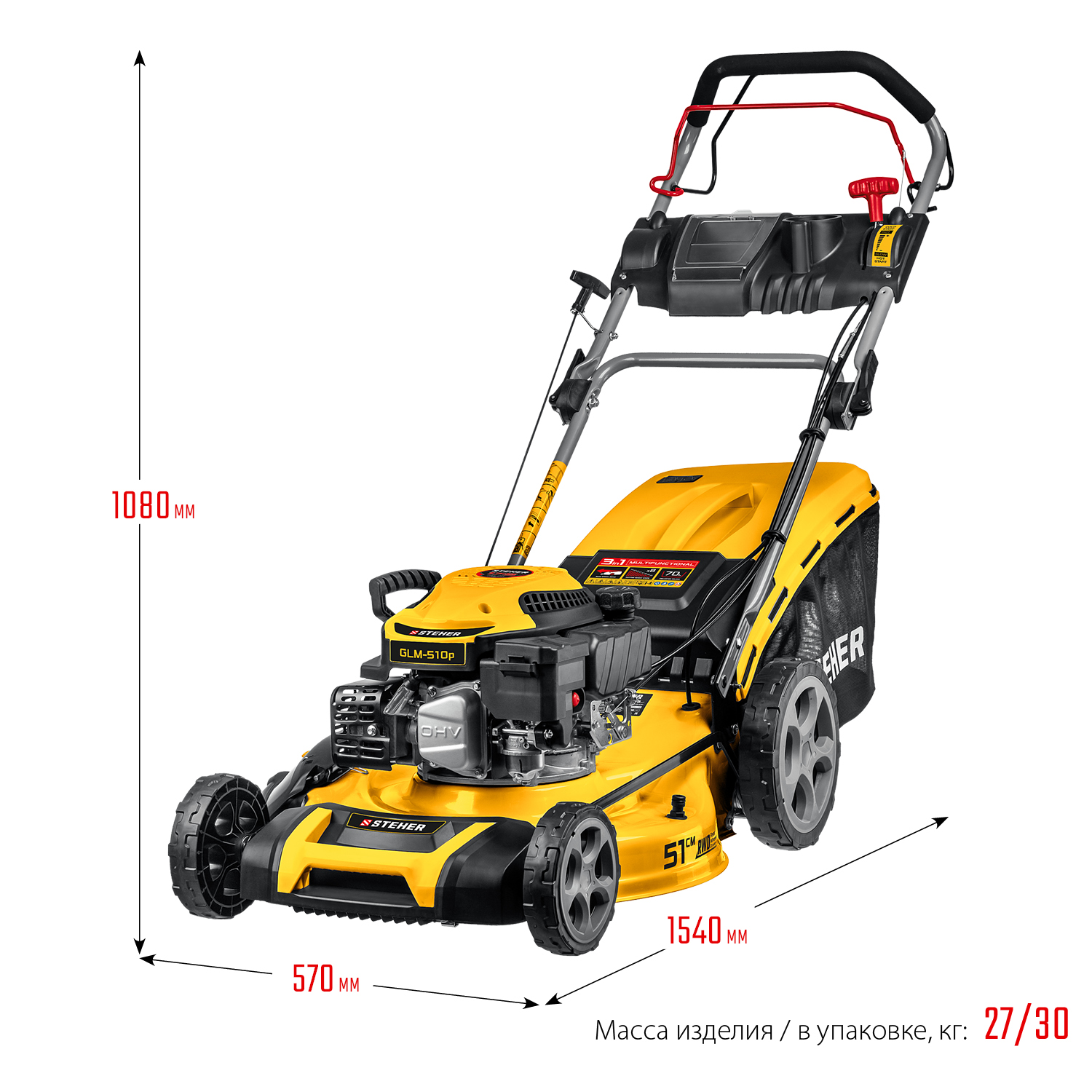 Для подстригания травы при уходе за газоном (с приводом режущего инструмента от двигателя внутреннего сгорания). Имеет функции кошения, мульчирования и выброса травы в сторону. Изделие предназначено для эксплуатации только вне помещений.