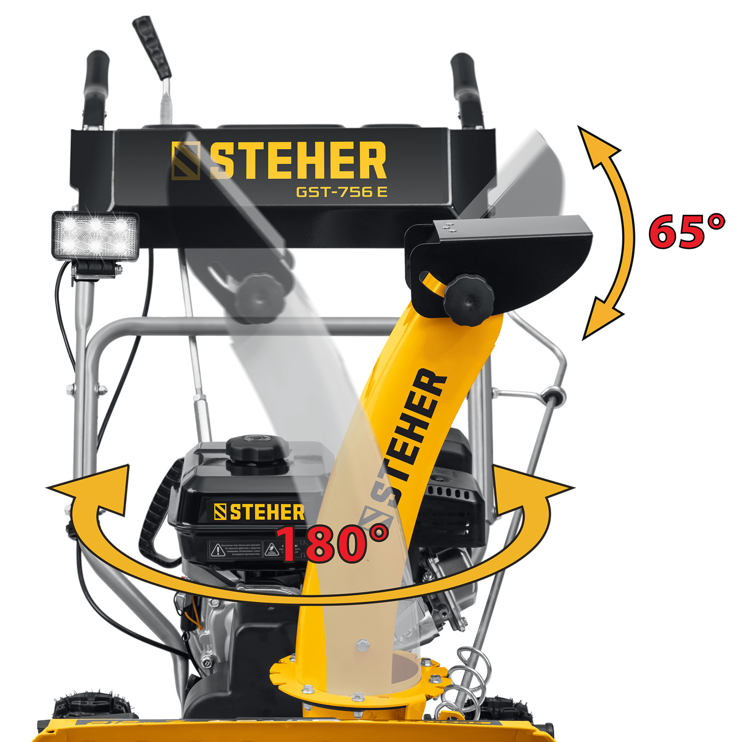 - -Винтовой привод поворотного желоба позволяет отбрасывать снег на расстояние до 12 м,
