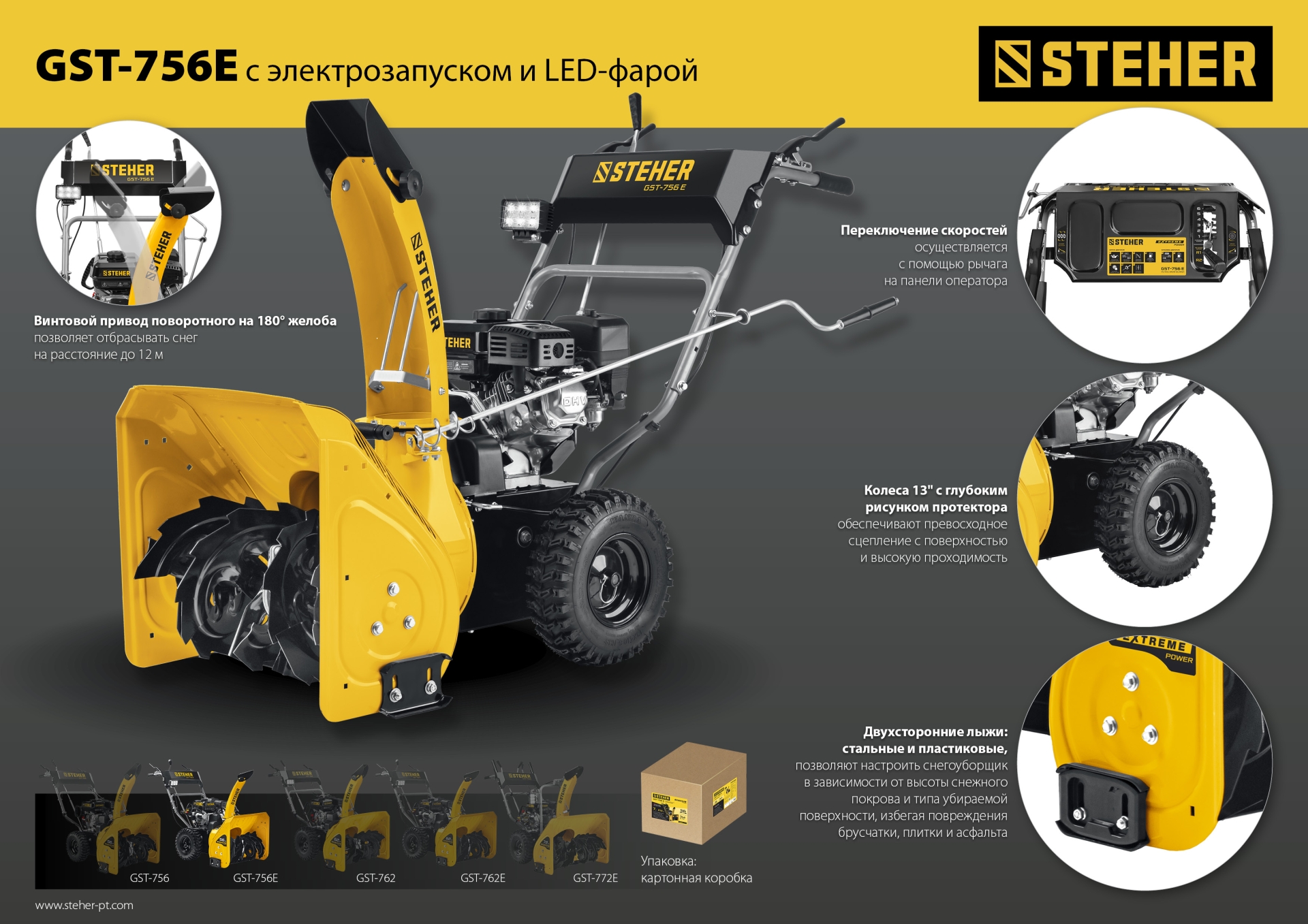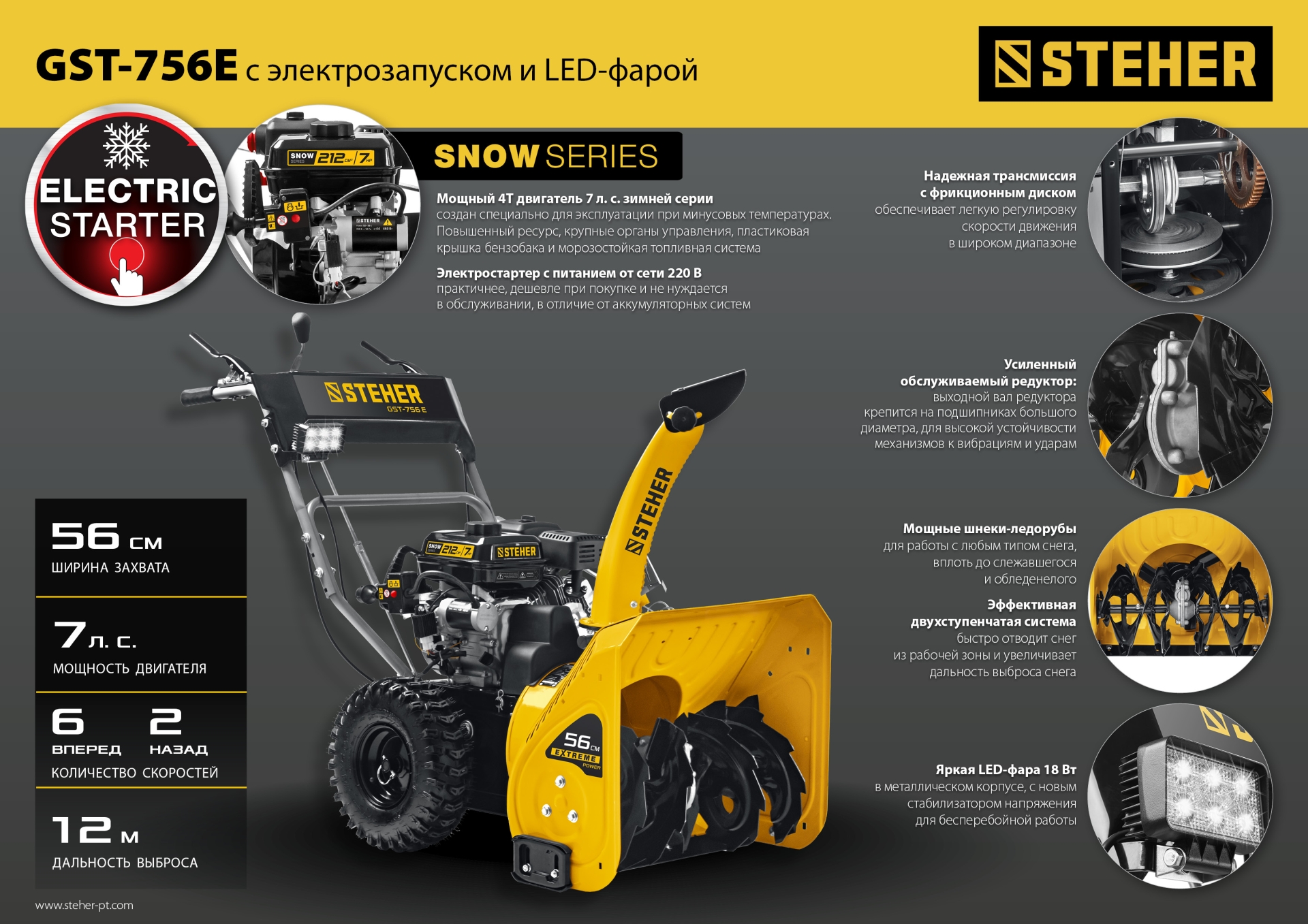 Компактный высокопроизводительный снегоуборщик STEHER создан специально для расчистки подъездных и пешеходных дорожек от снега. Оборудован зимним четырехтактным двигателем SNOW series созданным для эксплуатации в суровых зимних условиях.